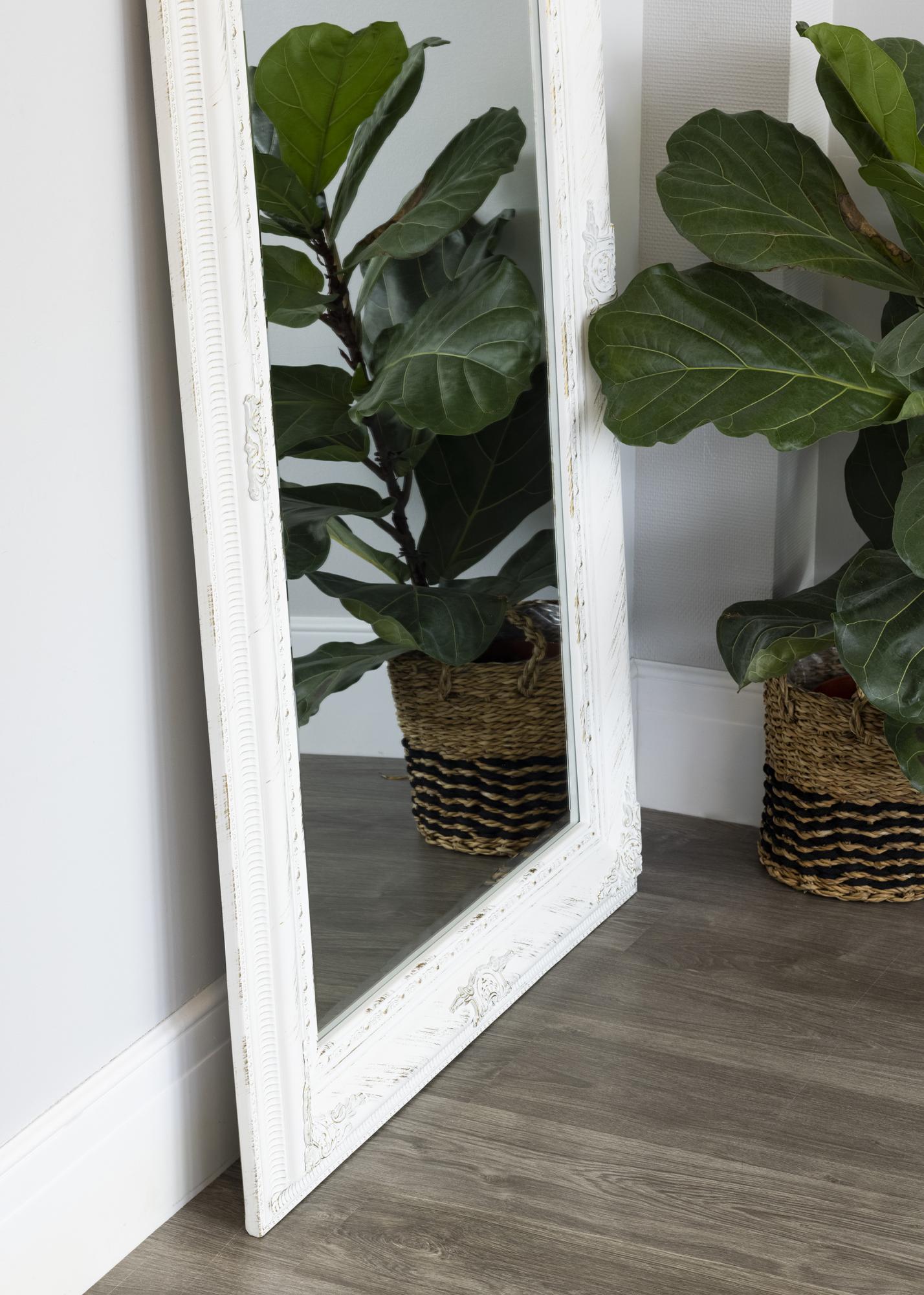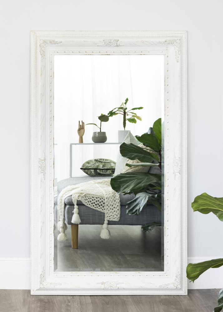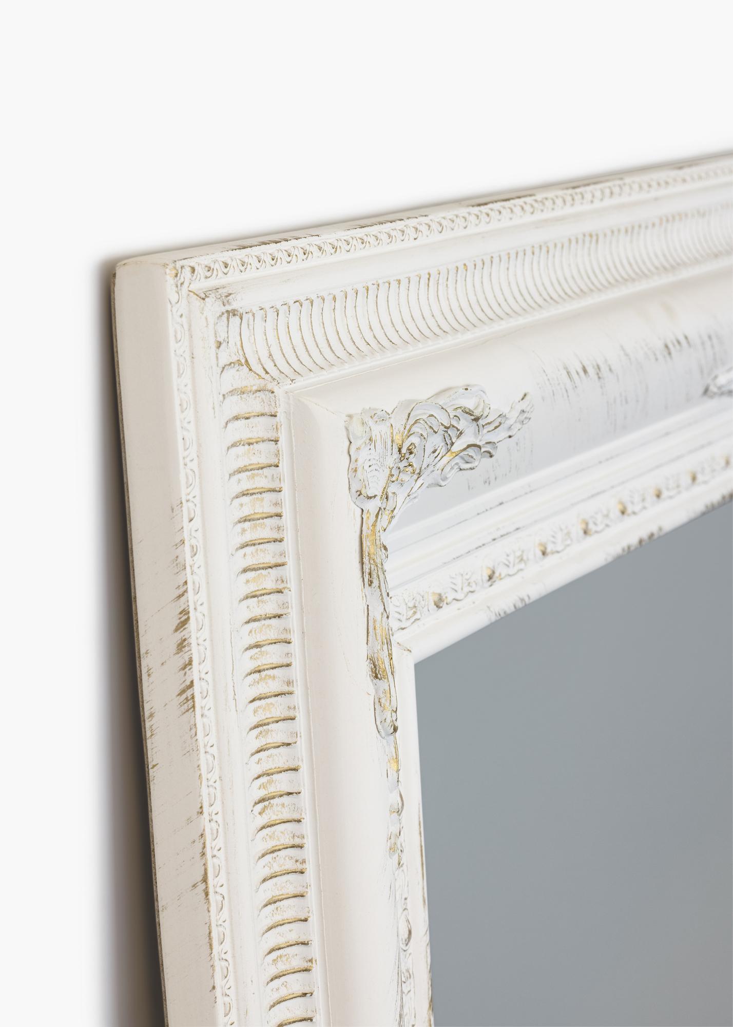Espelho em branco com uma sensação romântica, perfeito para quem deseja criar uma decoração que respire rosas, glamour e tempos passados. O espelho é bom para pendurar tanto na casa de banho acima de um móvel maior quanto no resto da casa, o tamanho faz com que ele se encaixe bem na parede acima de um aparador ou sofá robusto. O espelho também pode ser usado como parte de uma galeria de parede com quadros emoldurados com molduras brancas de estilo semelhante e ajuda a iluminar uma sala escura se for pendurado em frente a uma janela.