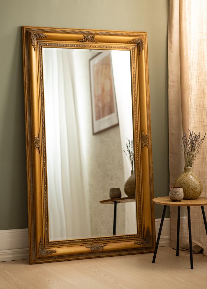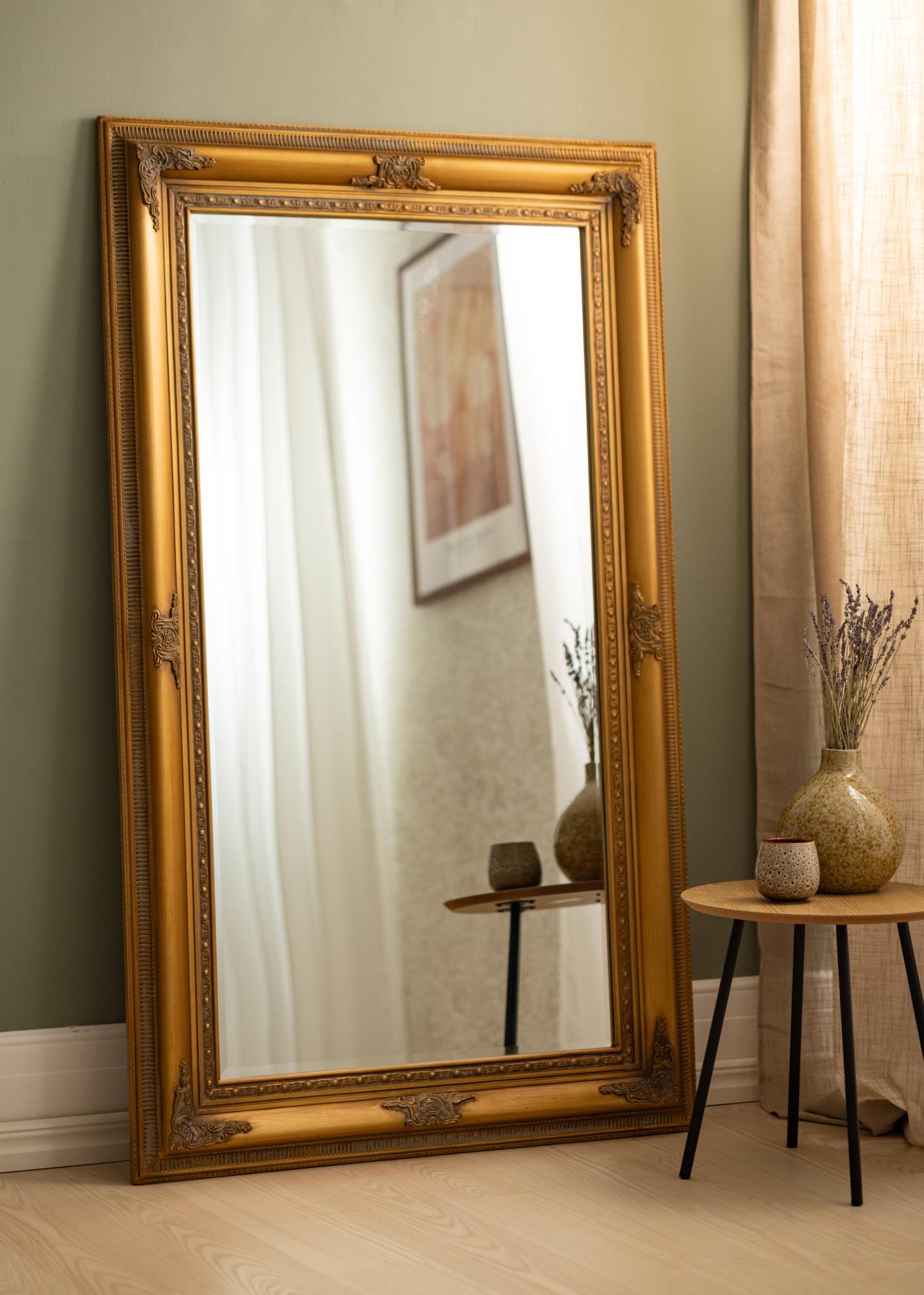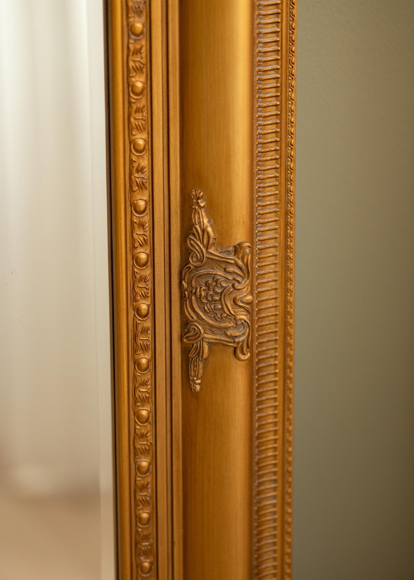 Espelho com um belo perfil dourado com uma sensação antiga, decorado com ornamentos florais. O estilo clássico da moldura do espelho faz com que ele se encaixe em estilos de decoração com móveis antigos, mas também pode ser usado para criar um contraste interessante em uma decoração moderna e elegante. O espelho fica bonito pendurado tanto no corredor, no quarto quanto em um closet e é realçado de forma elegante junto com acessórios de decoração em latão ou tons de ouro.