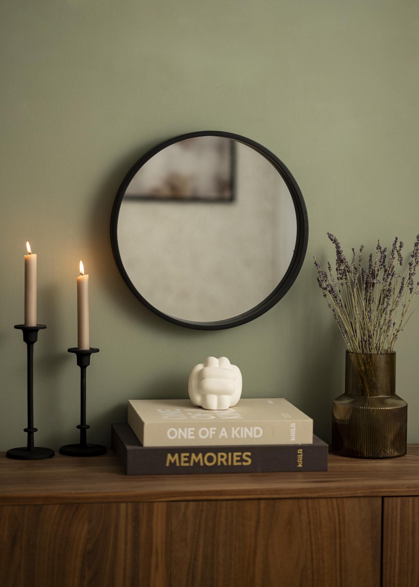 Iniciar o seletor de molduras »Espelho preto em forma de círculo elegante, disponível em vários tamanhos. Um dos nossos favoritos em espelhos.