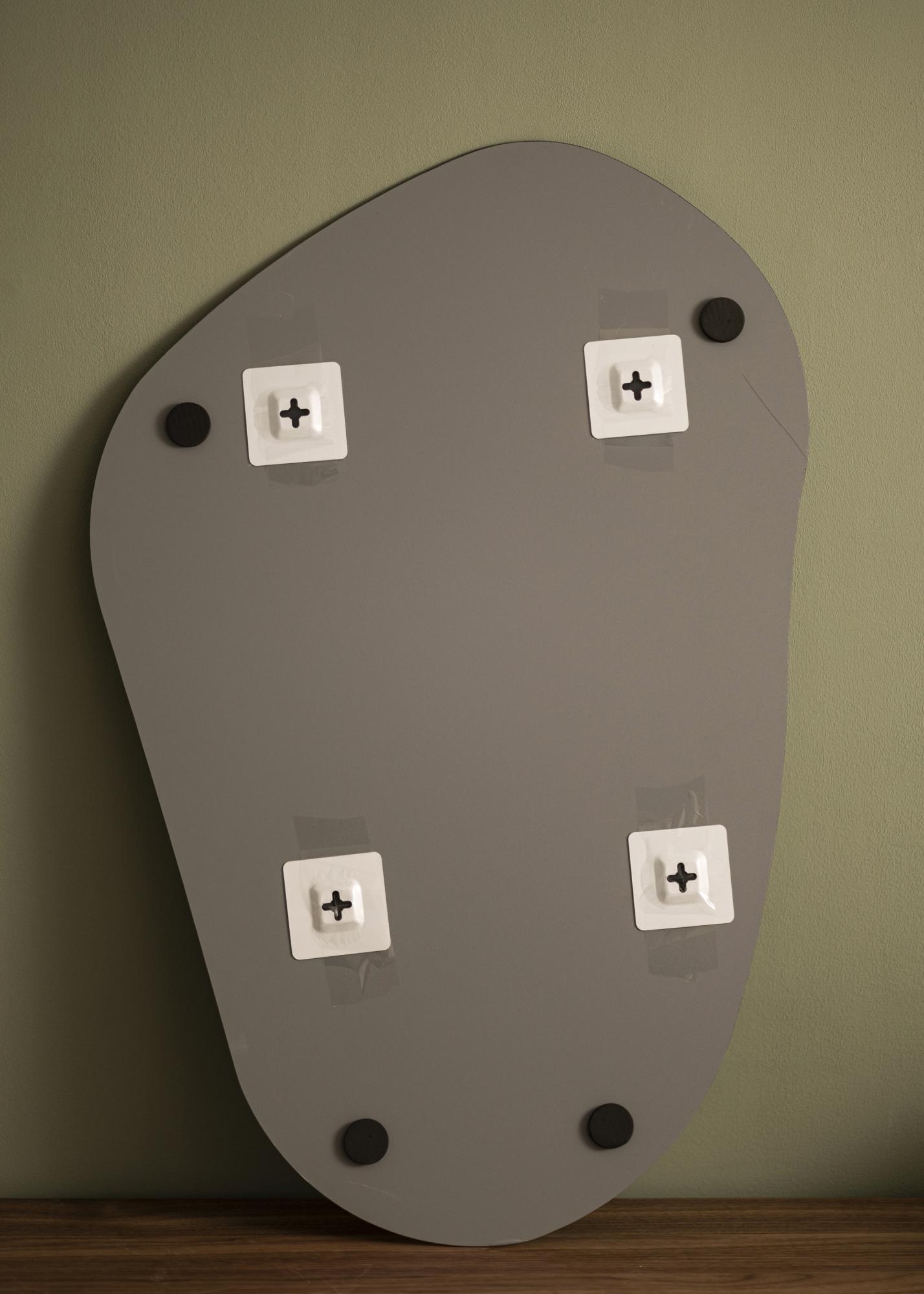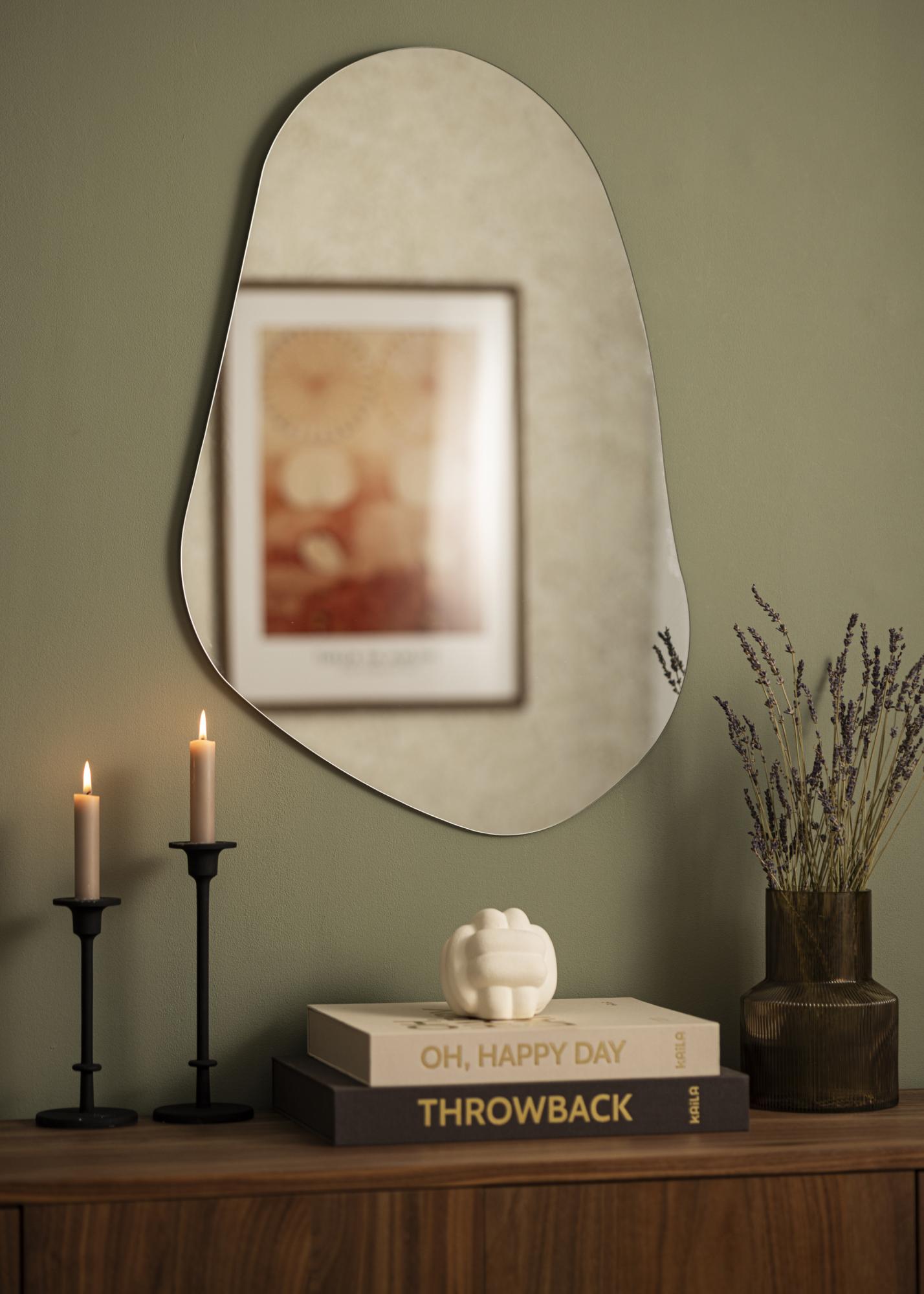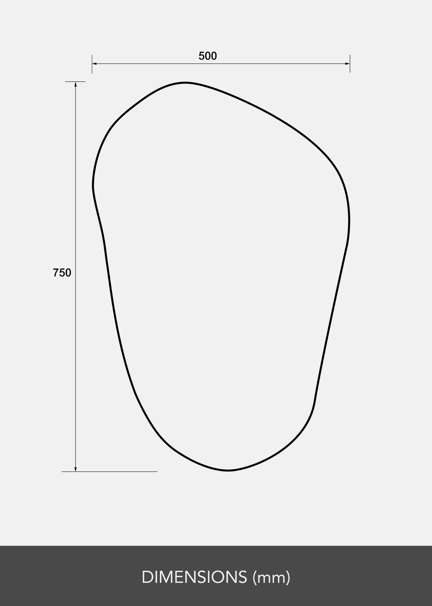 Este Espelho apresenta uma forma orgânica, assimétrica e suavemente ondulada, conferindo-lhe um toque moderno e artístico. Com as suas curvas arredondadas e ausência de arestas retas, faz lembrar um contorno desenhado à mão livre, semelhante a uma pedra moldada pela natureza ou a uma gota alongada.