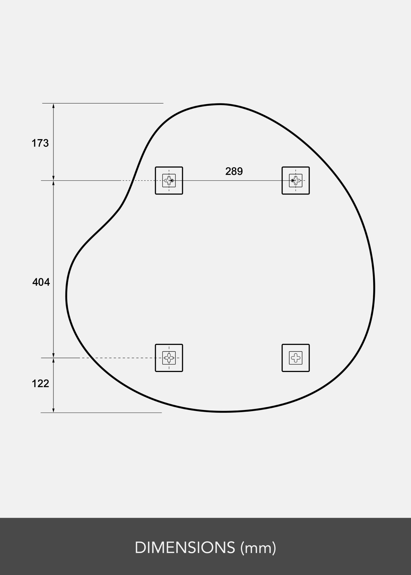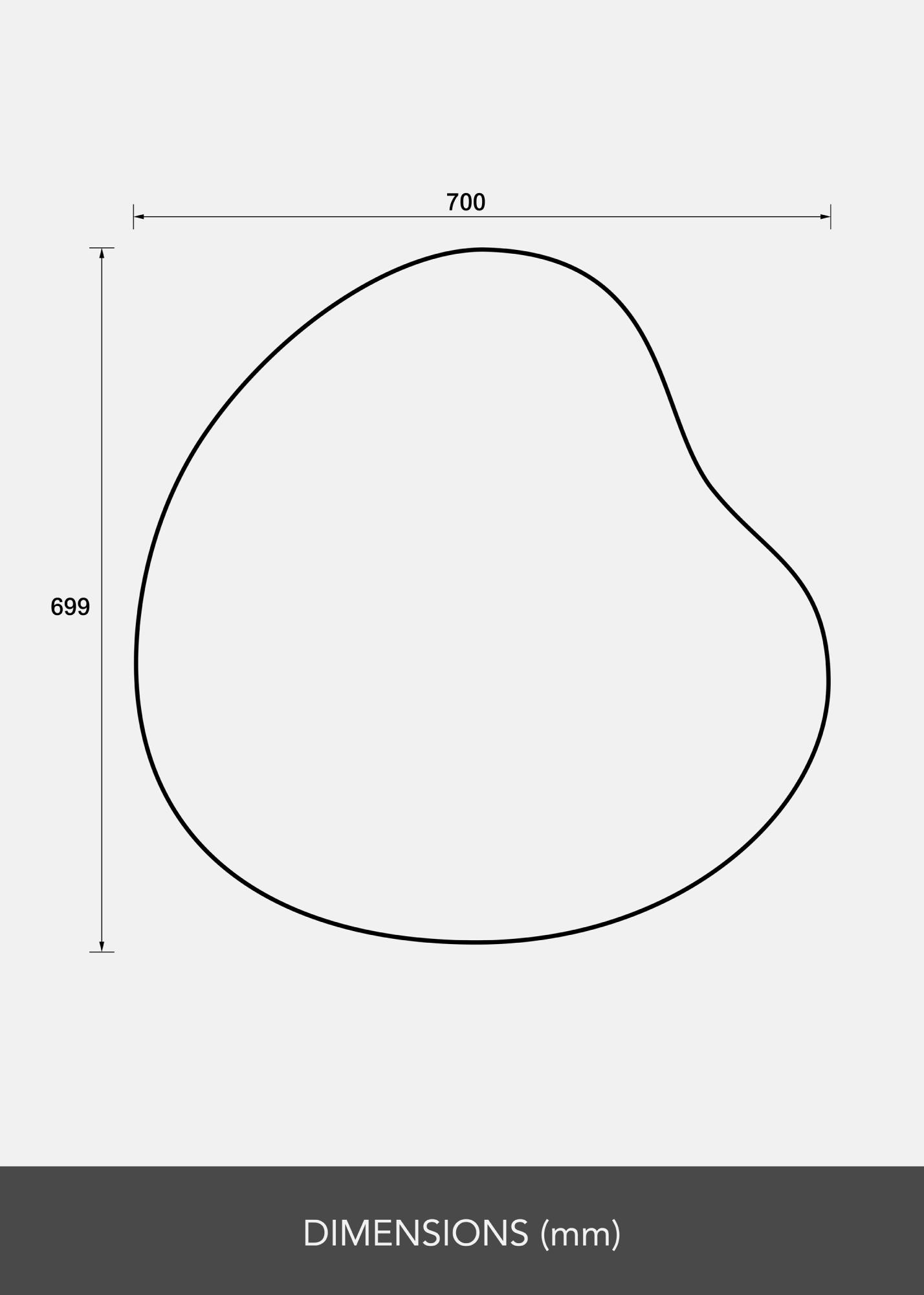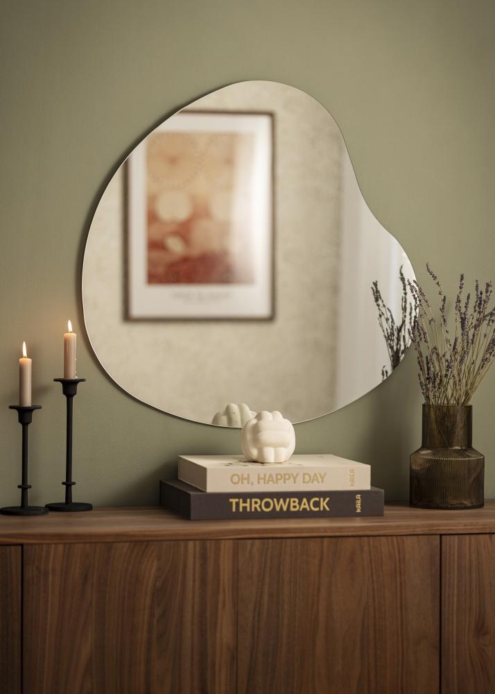 O espelho possui uma forma suavemente contornada e assimétrica que se curva graciosamente, transmitindo uma sensação de movimento e suavidade. Este design faz com que o espelho se torne um detalhe artístico na parede, mantendo sua função prática.
