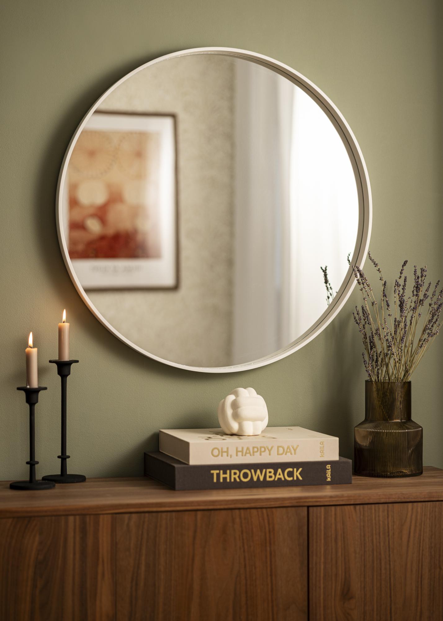 Descubra a elegância simples do nosso espelho redondo, um elemento intemporal de decoração que se encaixa perfeitamente em qualquer casa. A moldura branca ao redor do espelho acrescenta um toque de luz e pureza que complementa todas as cores e estilos do seu quarto. O seu design minimalista faz com que ele se misture enquanto permanece um acento distinto na parede.