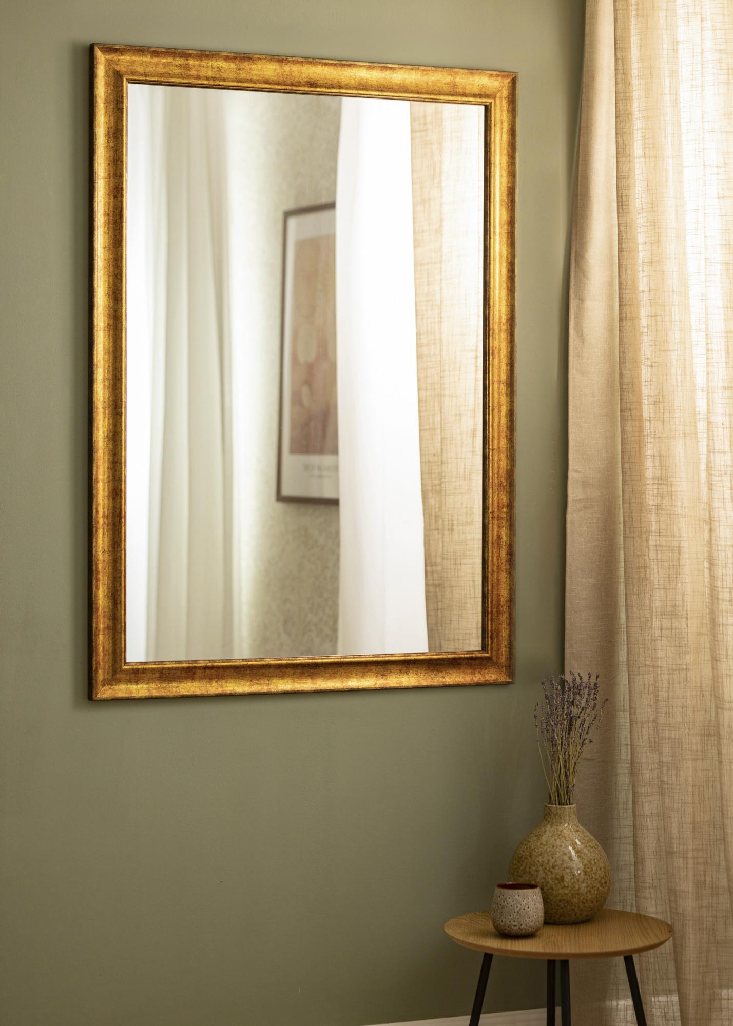 Um espelho de parede é um detalhe de decoração que é igualmente elegante e funcional. Além de poder olhar-se ao espelho no vidro do espelho, a cor dourada da moldura é um complemento perfeito para o resto da decoração da sua casa, seja escolher pendurar o espelho na sala de estar, no corredor ou no quarto.
