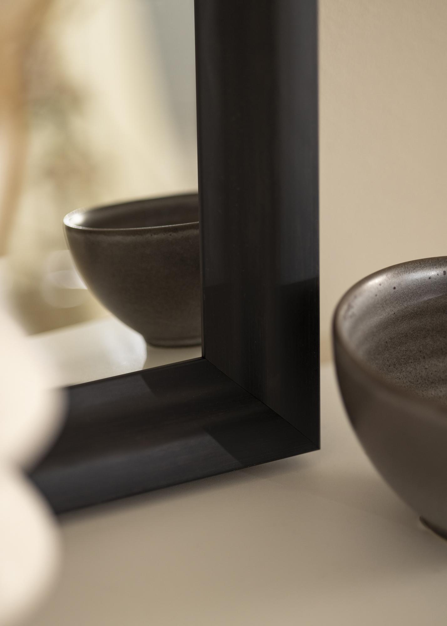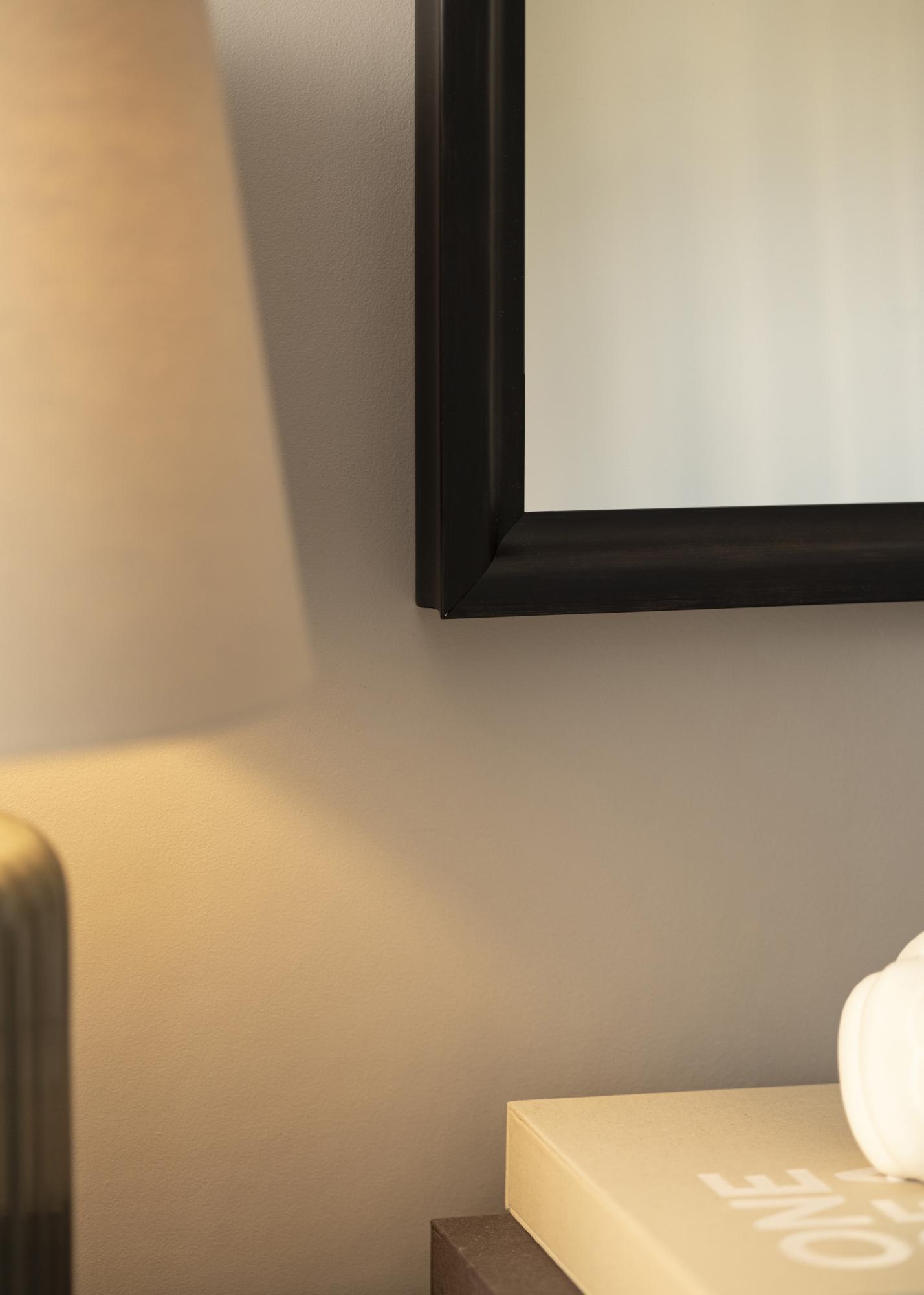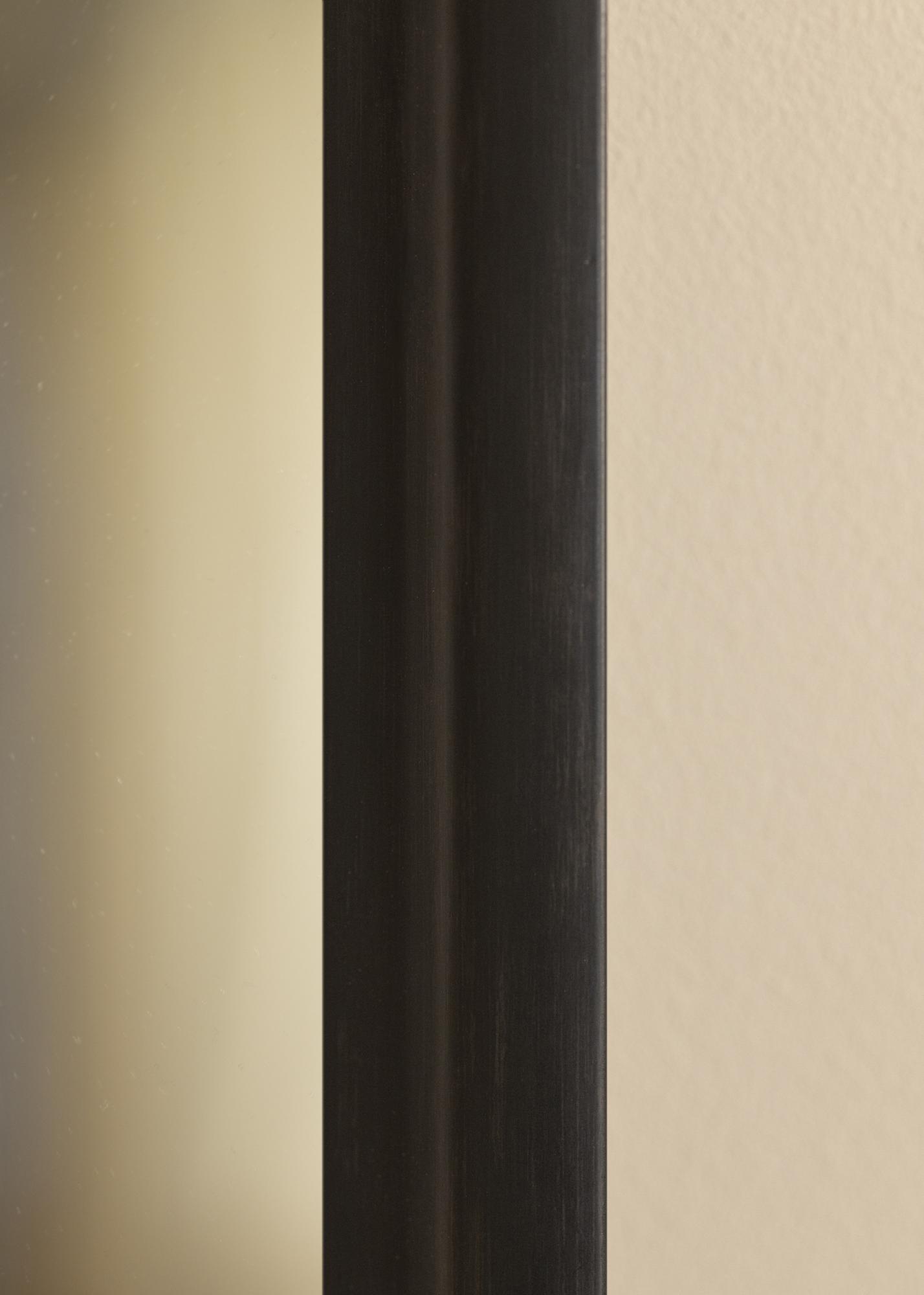 Tradicional espelho numa cor preto-marrom escura que está mais próxima do preto do que do marrom. Uma excelente escolha quando procura um espelho por medida em um tom escuro onde a estrutura da madeira é visível.