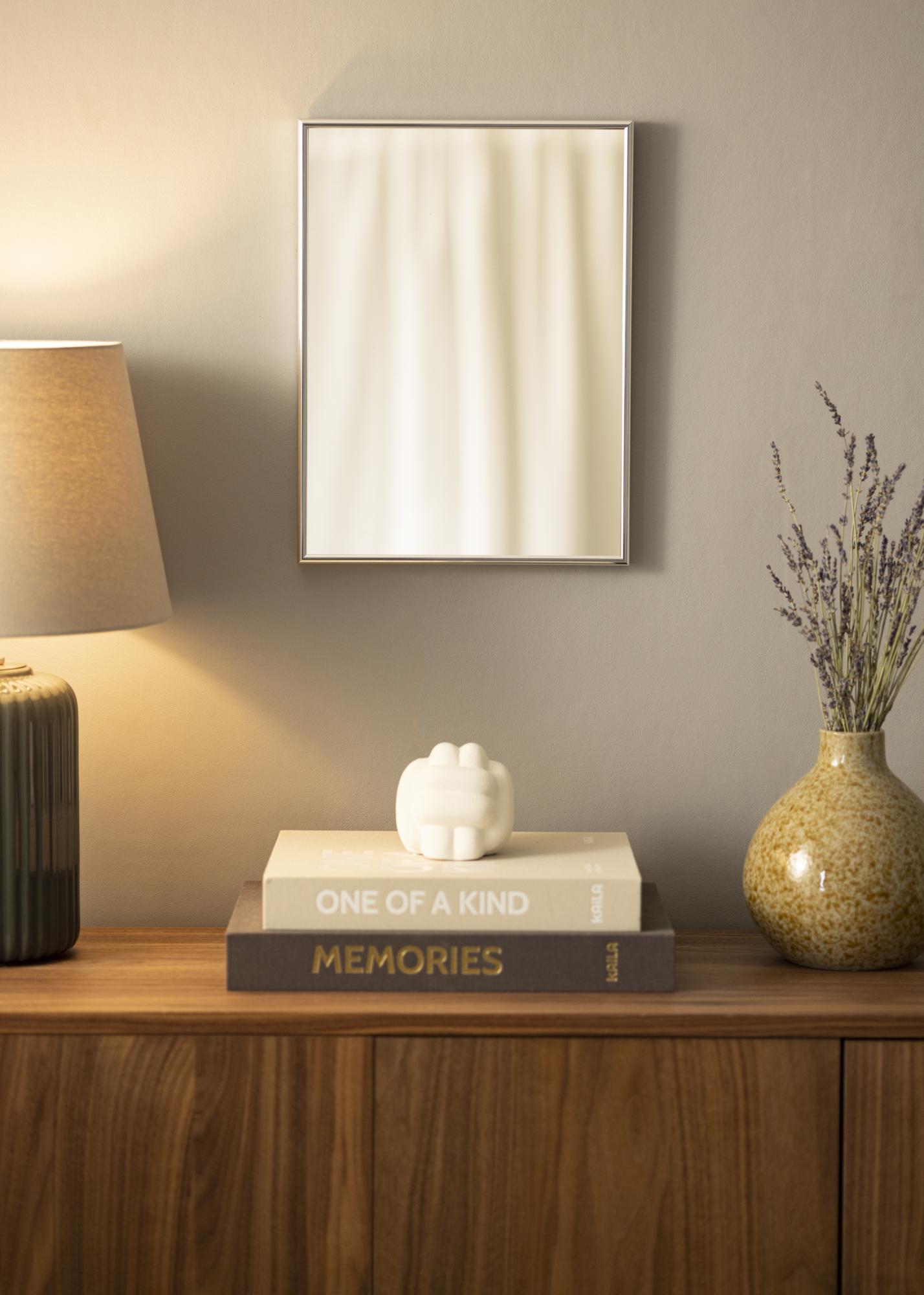 Sandhamn dá ao seu espelho uma moldura exclusiva com o seu perfil prateado brilhante escovado com uma profundidade de 26 mm, fazendo com que o espelho se projete um pouco para fora da parede.