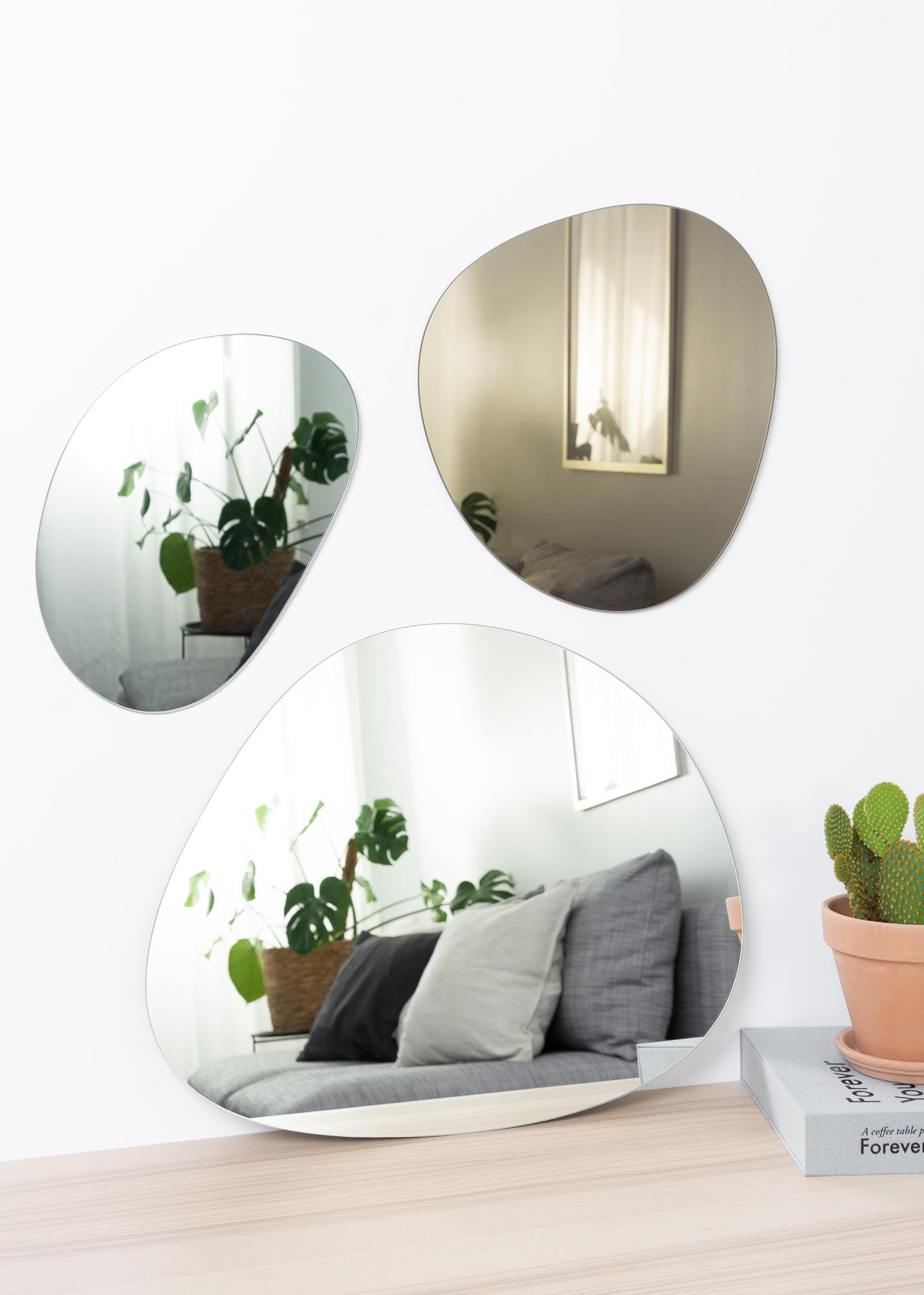 Este é um conjunto de espelhos elegante com 3 espelhos em tons de cinzento. Eles têm tamanhos diferentes para torná-los ainda mais divertidos ao colocá-los na parede. Os diferentes tamanhos desses espelhos ficam bonitos um ao lado do outro e eles se encaixam muito bem na parede, independentemente do tamanho do quarto.