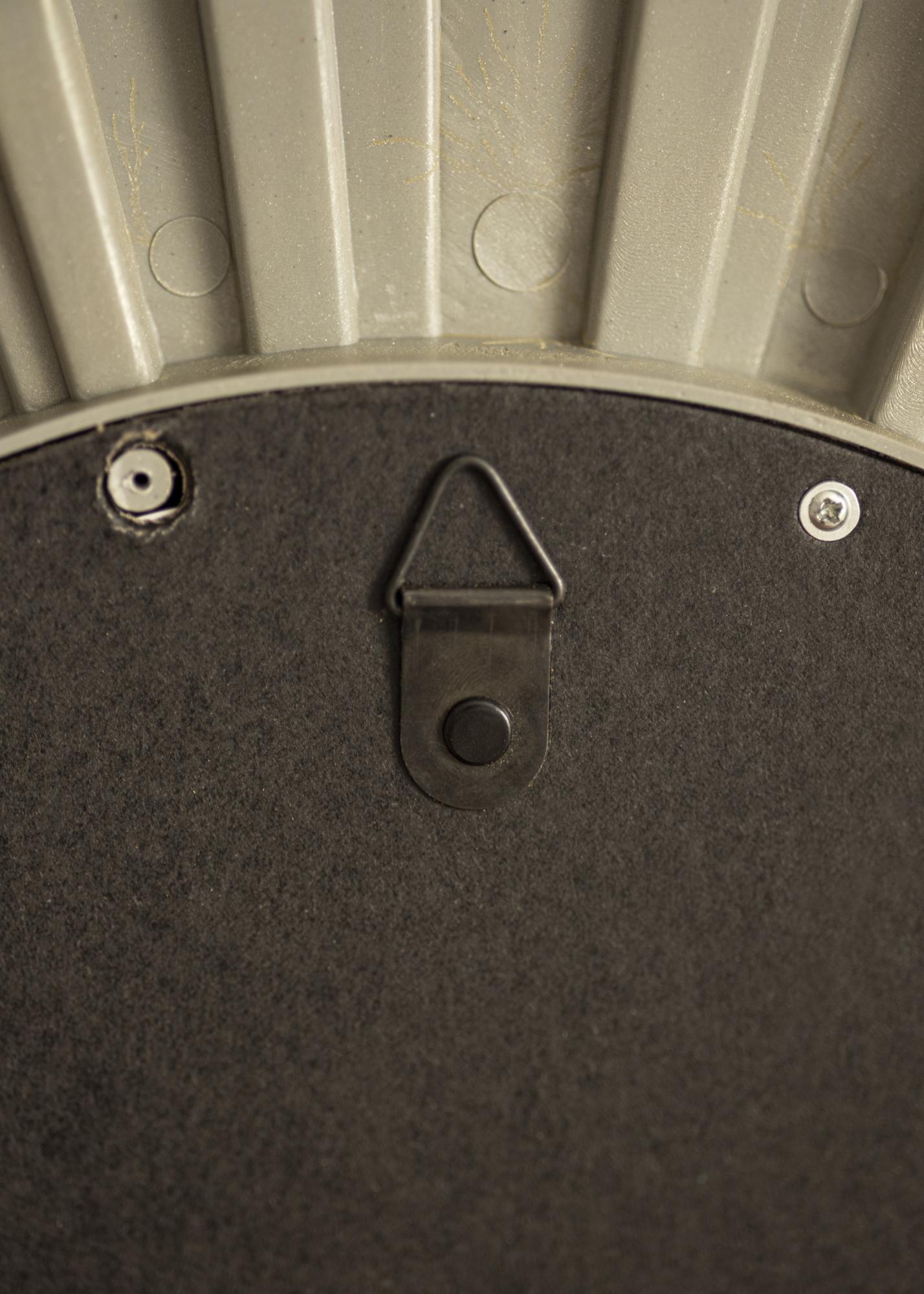 Este espelho redondo numa moldura muito decorativa em forma de sol. A moldura é dourada, o que dá ao espelho uma aparência elegante e limpa.