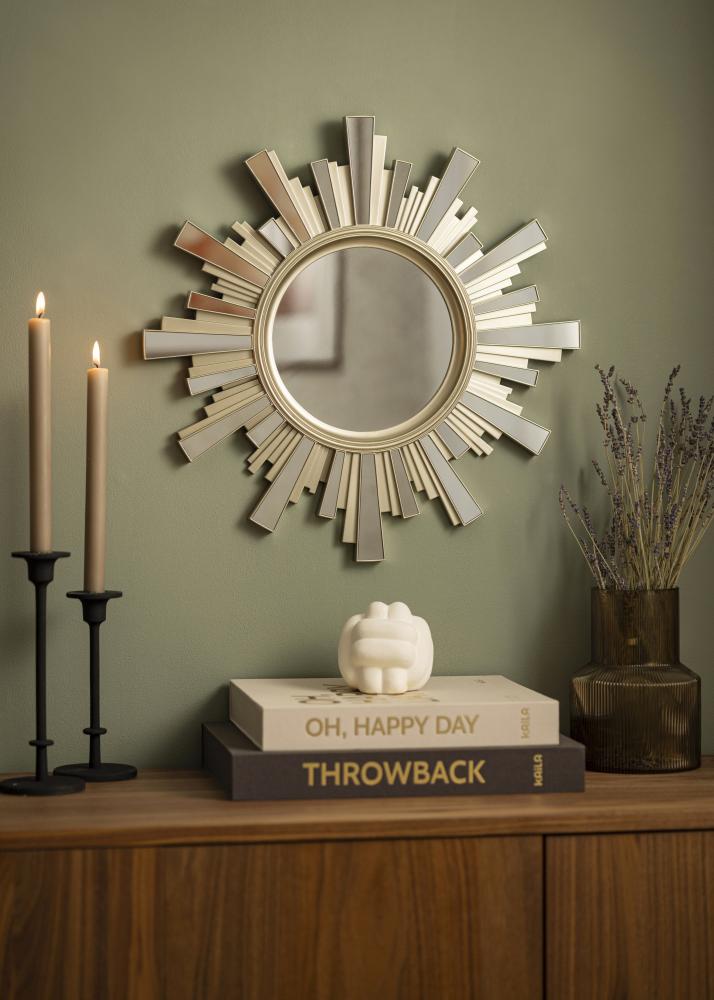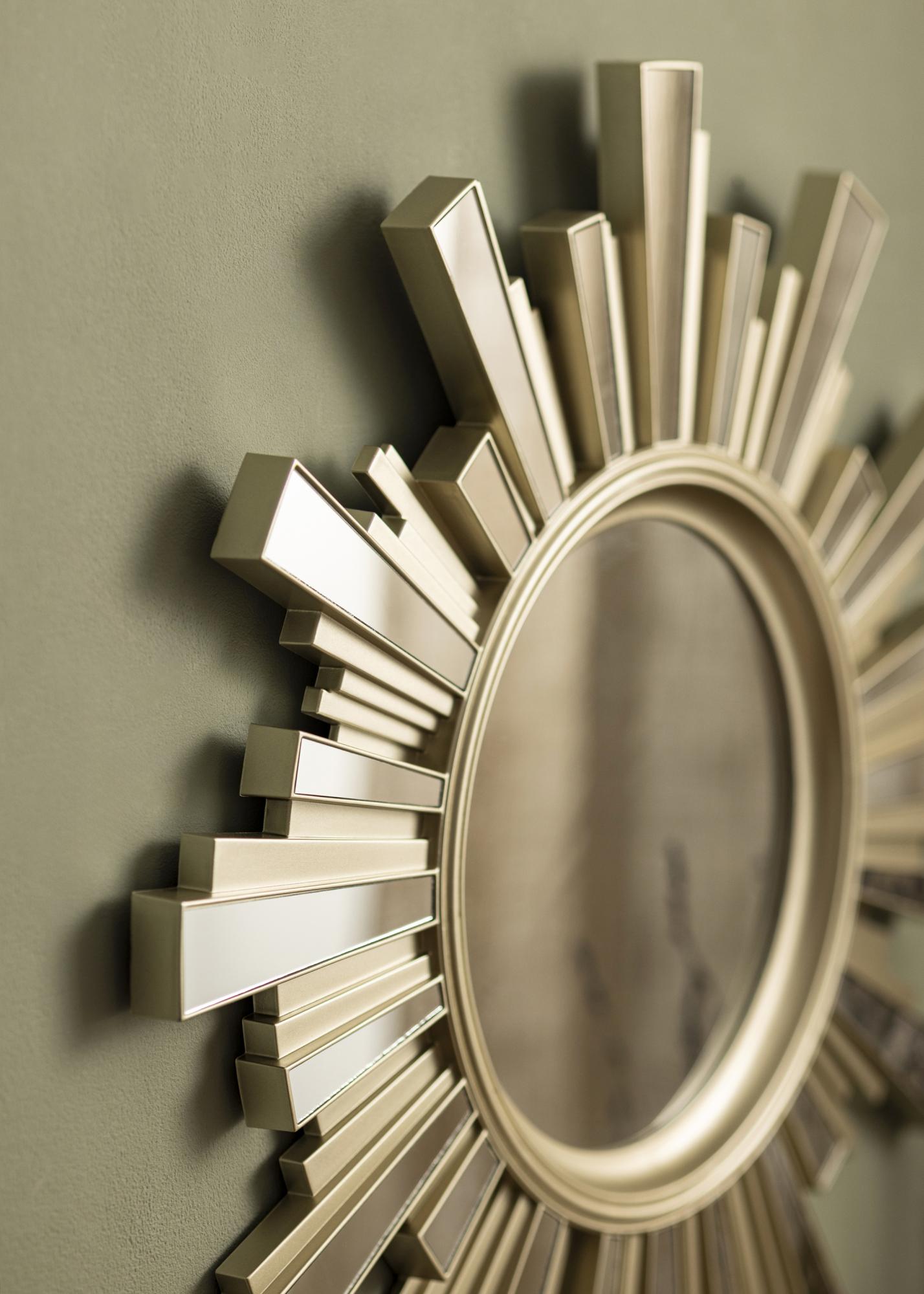 Coloque o espelho em um local onde ele possa ser visto e mostre todo o seu potencial decorativo - na sala de estar, na sala de jantar ou talvez no corredor. O espelho solar pode ficar sozinho na parede ou em conjunto com outra bela decoração de parede.