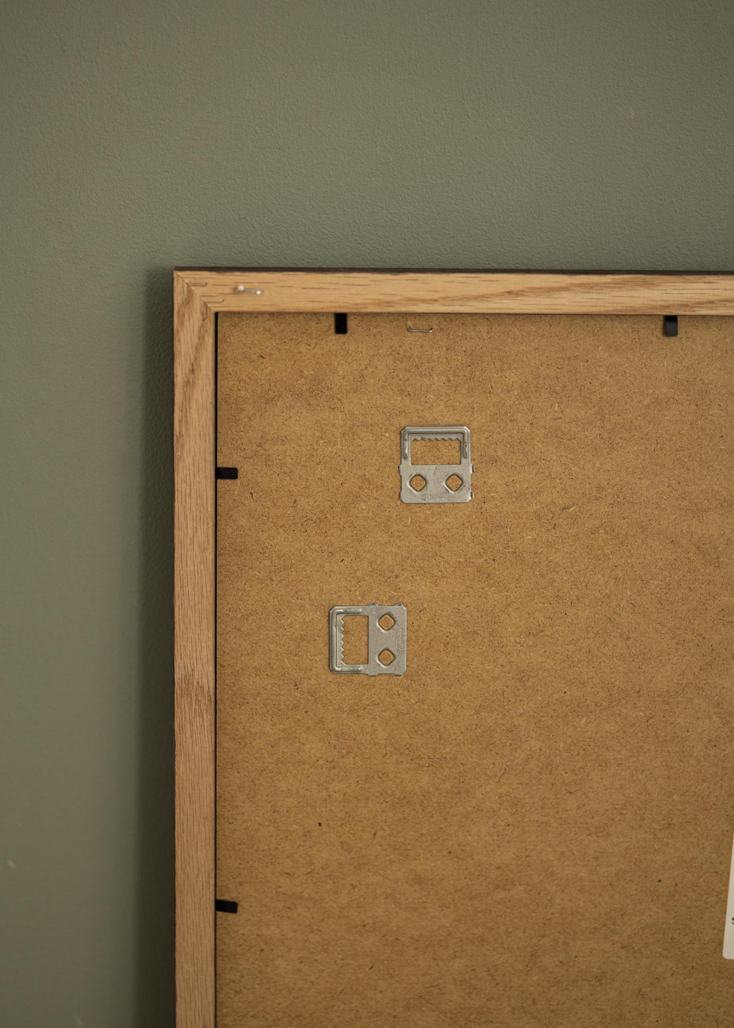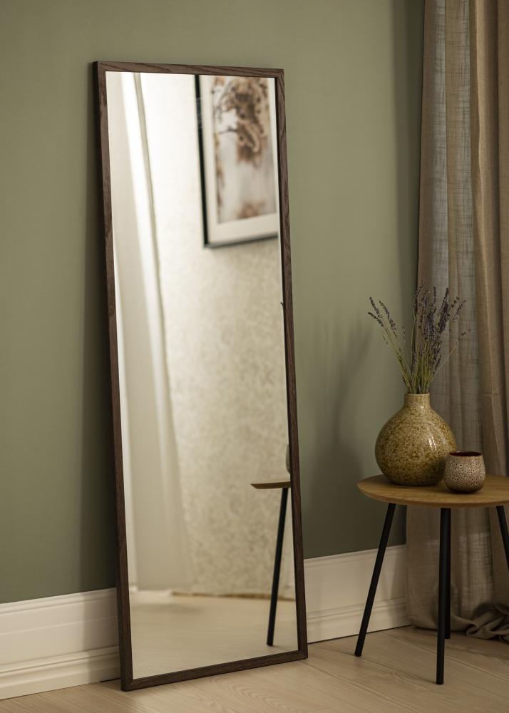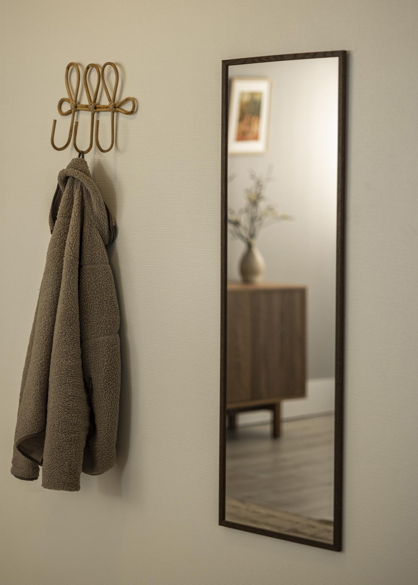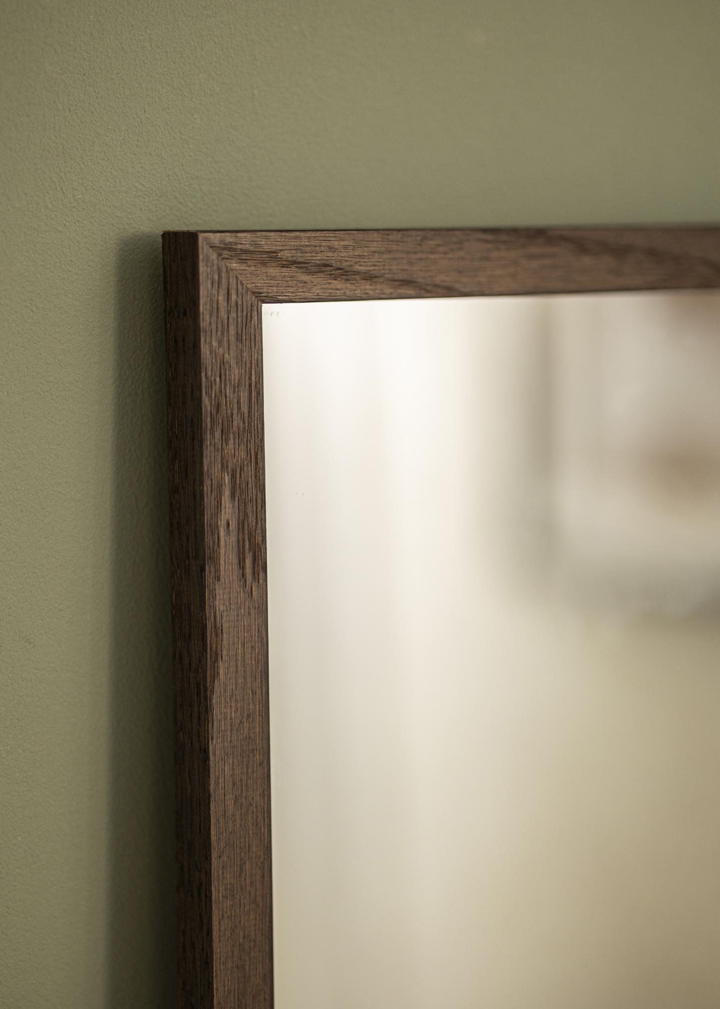 A moldura do espelho é feita de madeira de carvalho genuína e possui um tom escuro e profundo que imediatamente atrai o olhar. A espessura da moldura contribui para uma sensação de robustez e confere uma presença marcante ao espelho na parede. Este espelho não é apenas um objeto de uso prático, mas também uma obra de arte que complementa e realça sua decoração.