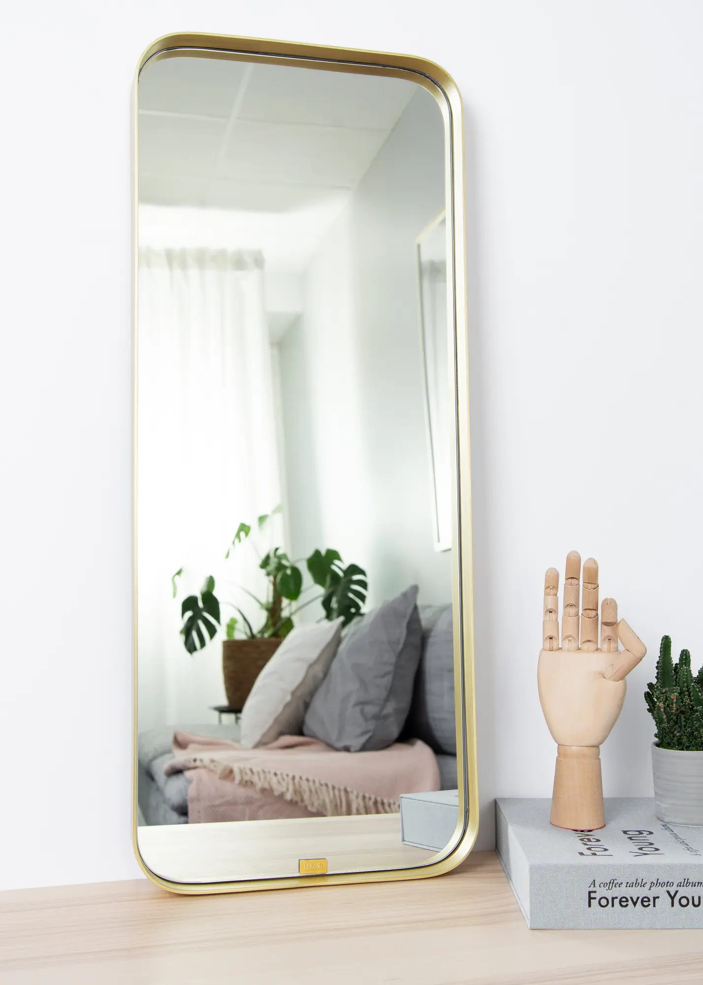 Um espelho retangular num design dinamarquês elegante. A moldura tem cantos arredondados e é feita de metal com acabamento em latão, o que dá uma impressão suave e elegante. O espelho pode ser fixado na parede ou simplesmente apoiado na parede em cima de uma cómoda ou prateleira. Este espelho de bom gosto é da marca dinamarquesa Hübsch.
