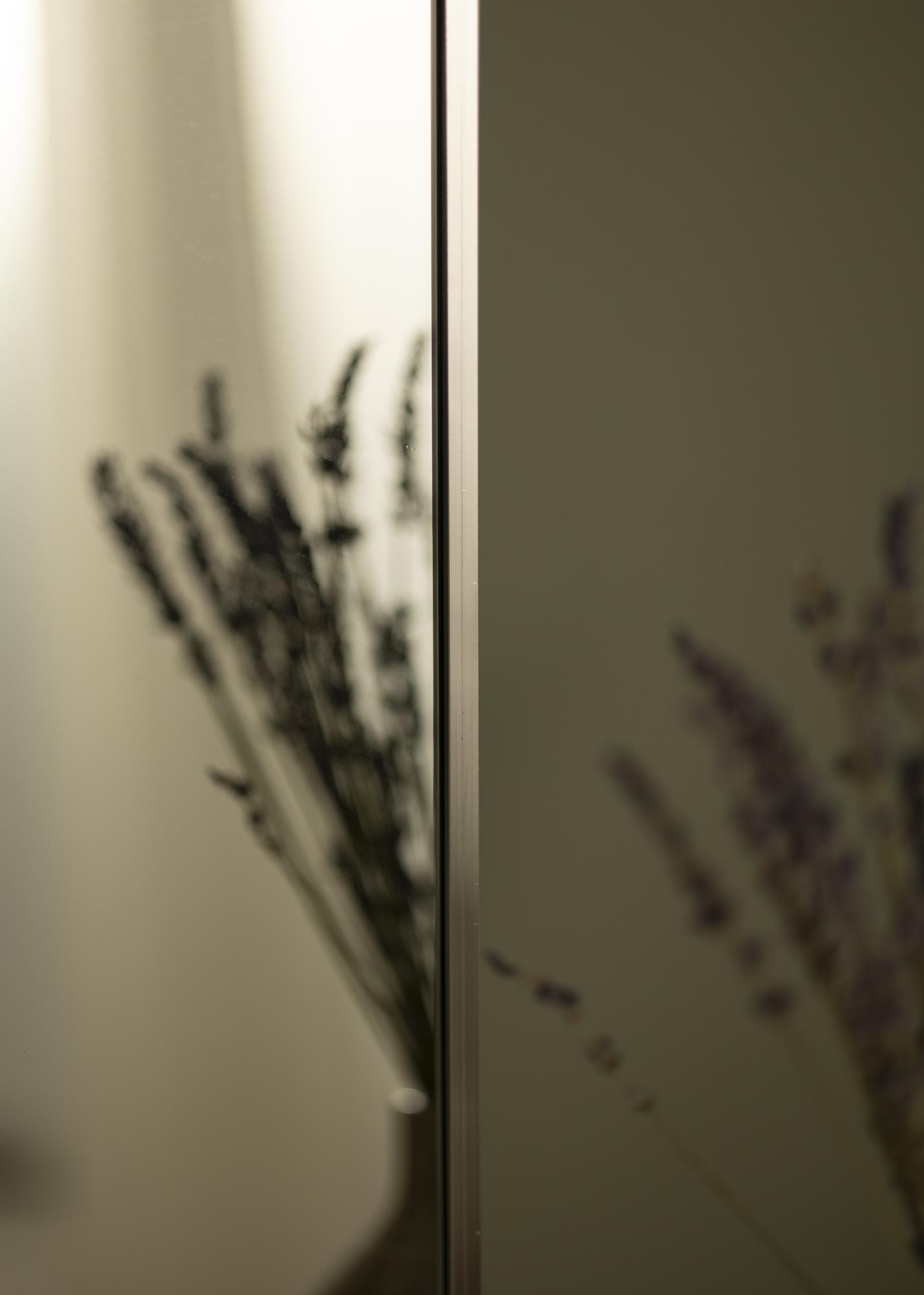 Este espelho é adornado por uma moldura fina de alumínio prateado, que adiciona um toque de sofisticação à sua decoração. Sua forma retangular é atemporal e moderna, combinando com uma variedade de estilos de decoração. O design minimalista do espelho permite que ele se integre ao ambiente ao mesmo tempo que se destaca como um detalhe elegante.