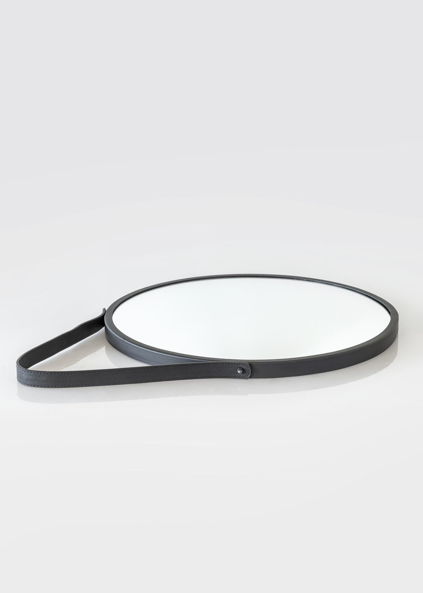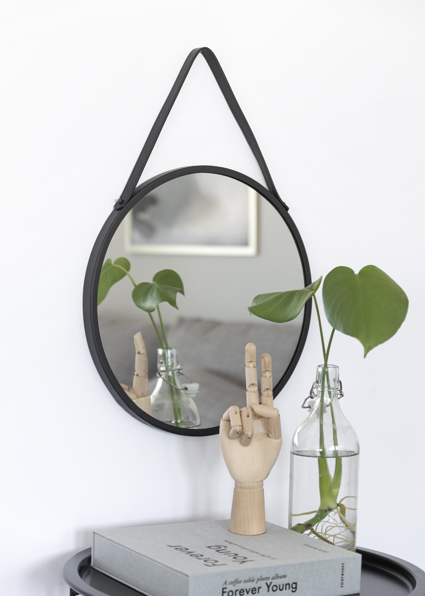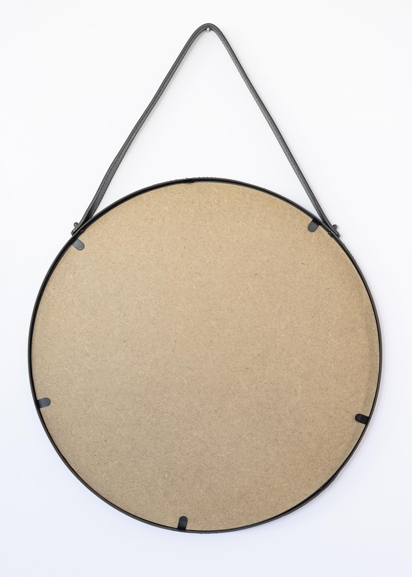 Trapani é um espelho de parede redondo e elegante, com uma moldura de metal preto. O espelho redondo pendura lindamente na parede com uma elegante e funcional alça de couro PU (couro sintético). Decore o seu hall de entrada, quarto ou sala de estar com este espelho altamente decorativo.