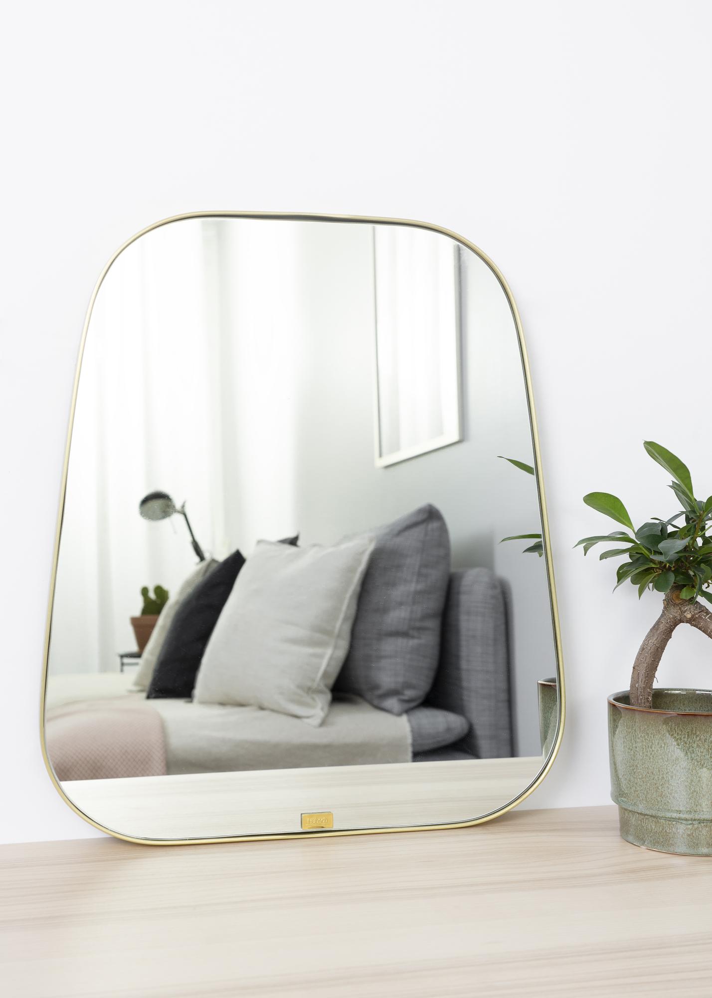 Um espelho de parede que se destaca da multidão! Com a sua forma criativa e bonita, este espelho é um componente perfeito para decoração na maioria das casas - e na maioria das divisões. O espelho é cercado por uma moldura fina e elegante em latão, o que confere-lhe uma aparência elegante.
