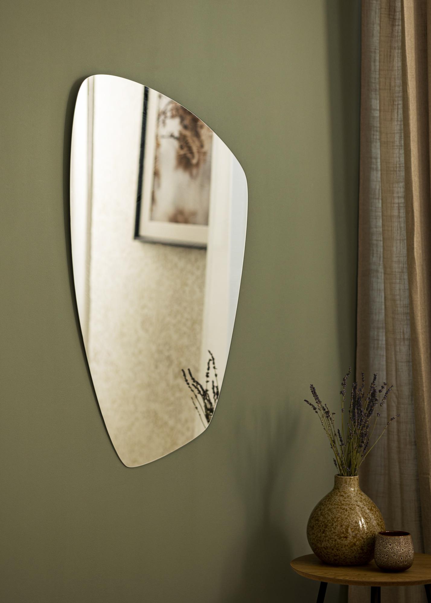 O espelho possui uma forma assimétrica e curva que dá uma expressão moderna e elegante, perfeita para um estilo de decoração contemporâneo. Seu design único contribui para uma sensação de espaço e luz no ambiente, ao mesmo tempo em que funciona como um detalhe prático e decorativo.