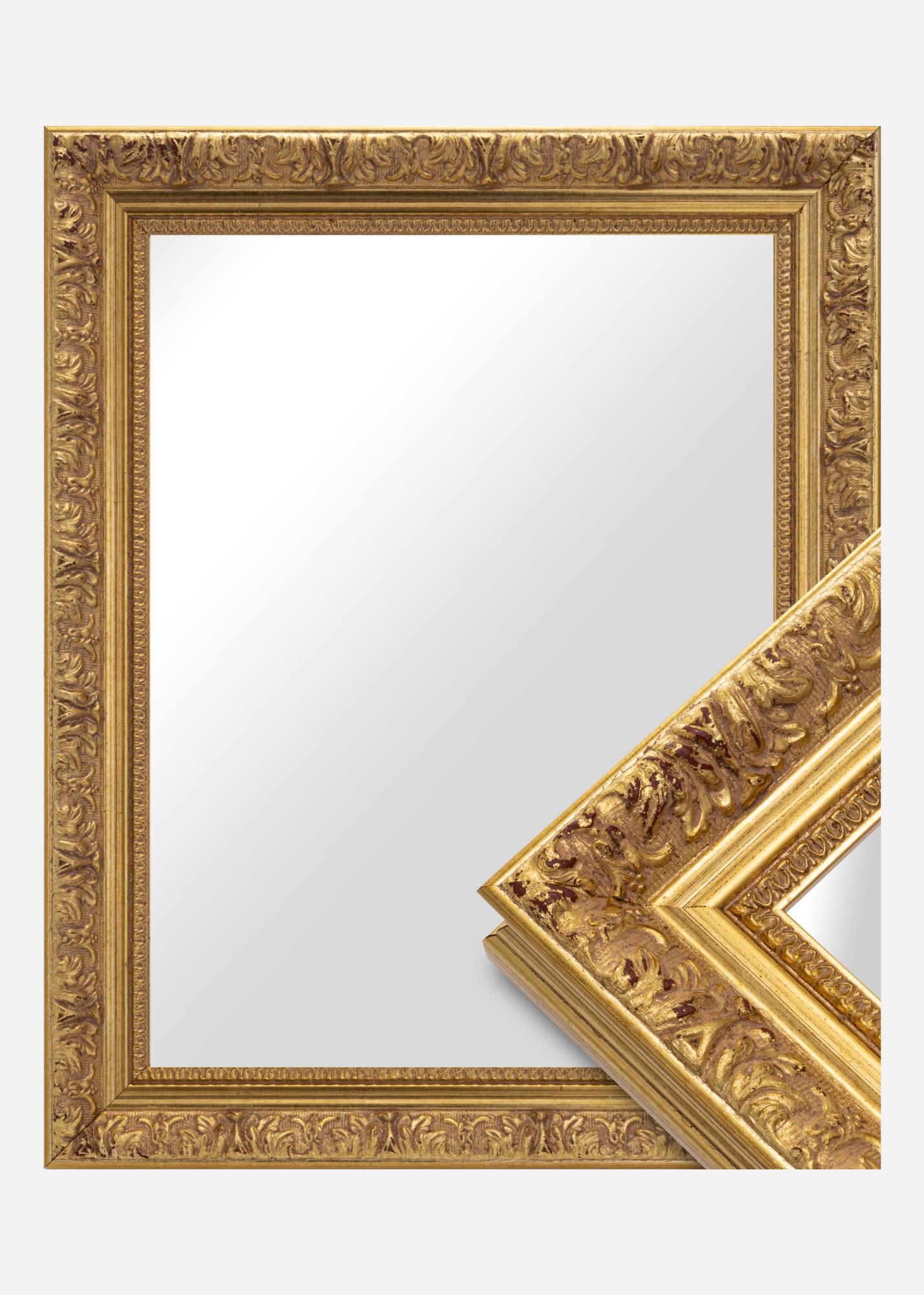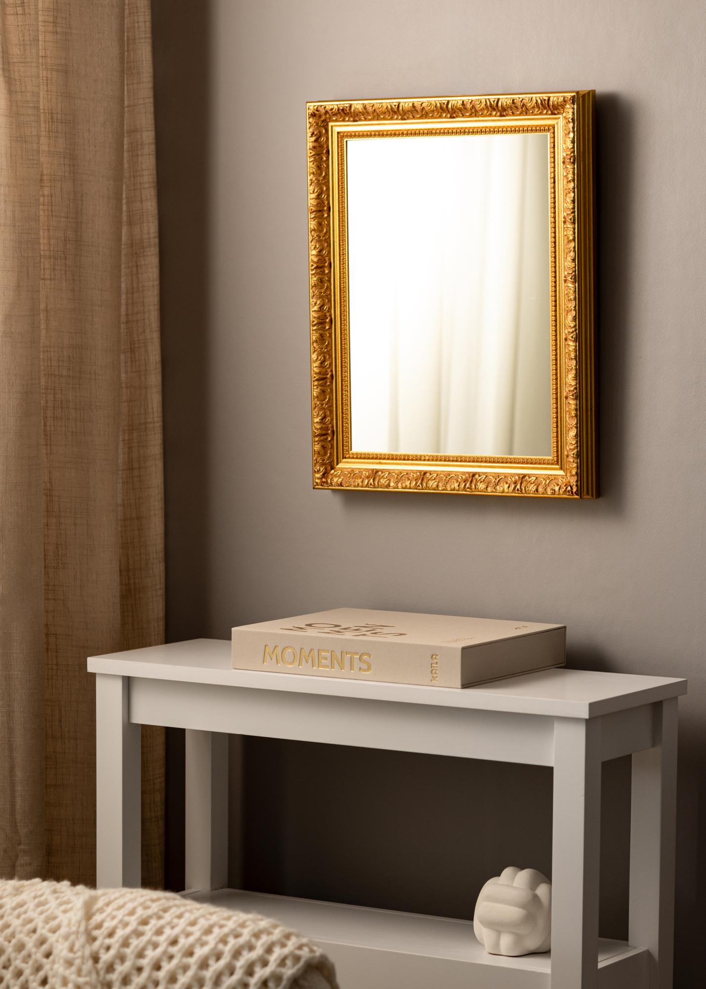 Espelho Vesta Ouro é um espelho feito sob medida que fabricamos para atender às suas necessidades. Com seu design clássico e elegante cor dourada, torna-se um elemento estiloso em qualquer ambiente. A moldura do espelho tem 51 mm de largura e uma profundidade de 48 mm, conferindo-lhe uma sensação robusta e sólida.