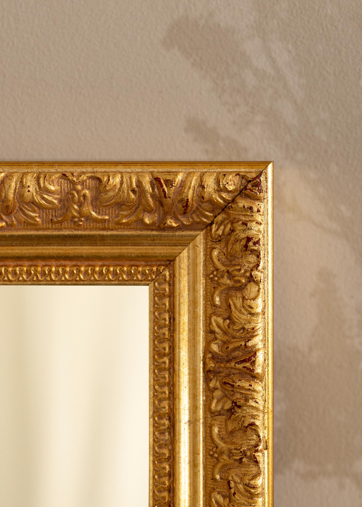 Este espelho é feito de pinho e possui um acabamento antigo que realça seus ornamentos detalhados. O rico tom dourado é combinado com sutis tons de vermelho, conferindo ao espelho um caráter atemporal e sofisticado. Seja na entrada, na sala de estar ou no quarto, o Espelho Vesta Ouro trará ao ambiente uma sensação de luxo e elegância.