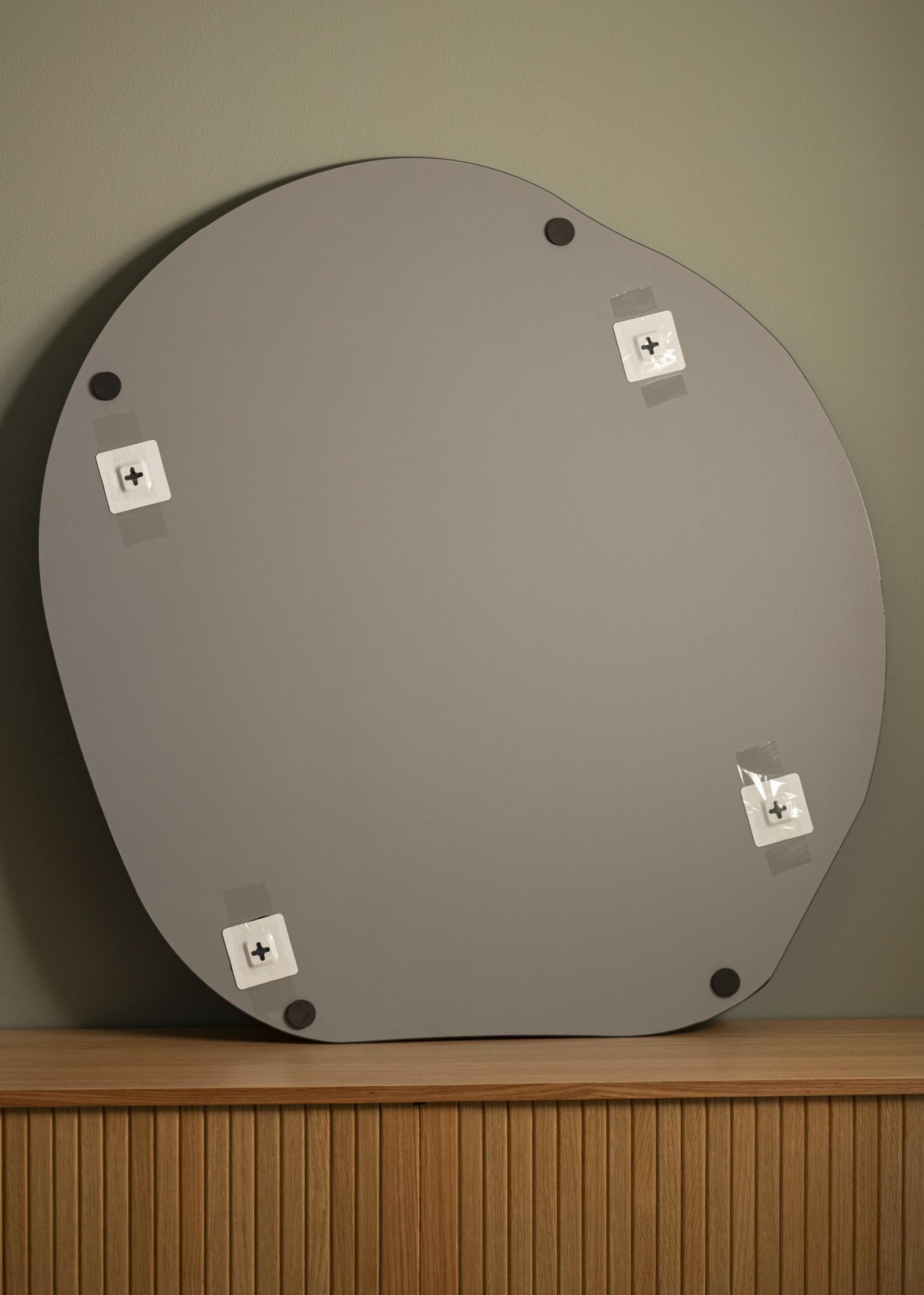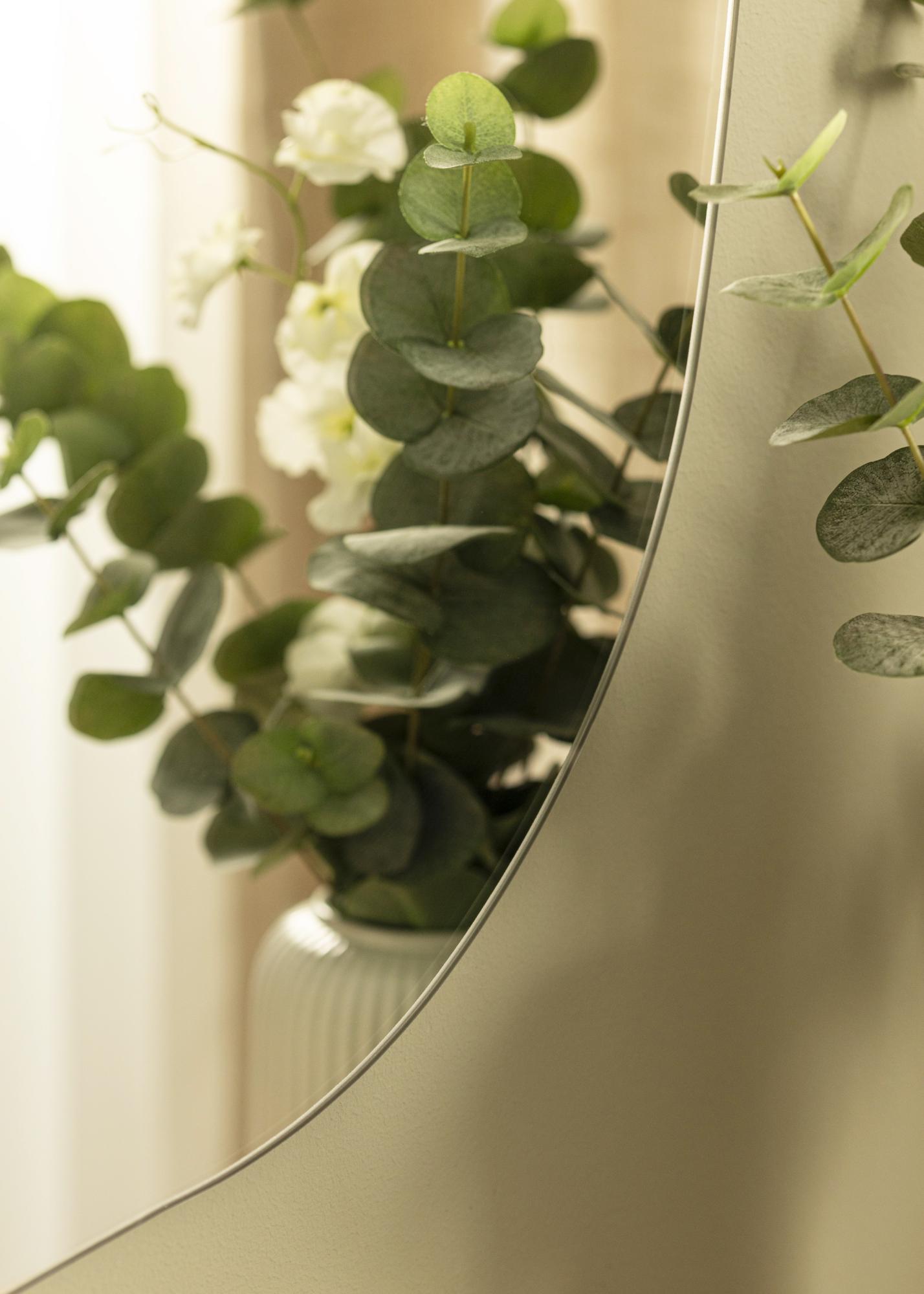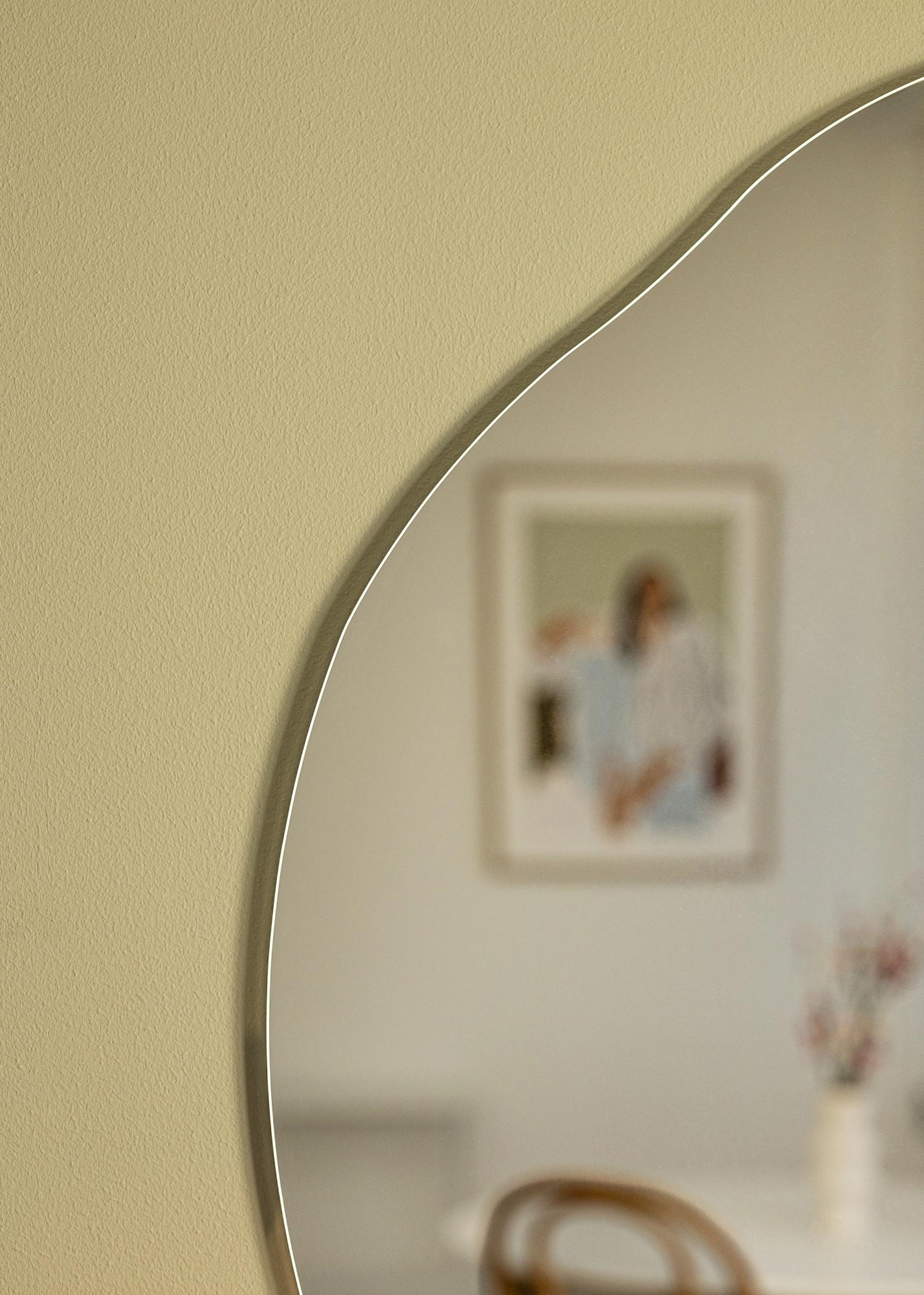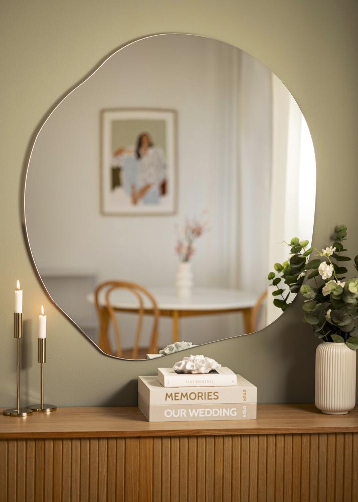 O espelho tem uma forma arredondada, quase orgânica, com linhas suaves e fluídas que criam uma sensação relaxante e convidativa. Este design faz com que o espelho seja um ponto focal natural no cômodo e traga uma sensação de elegância e suavidade para a sua decoração.