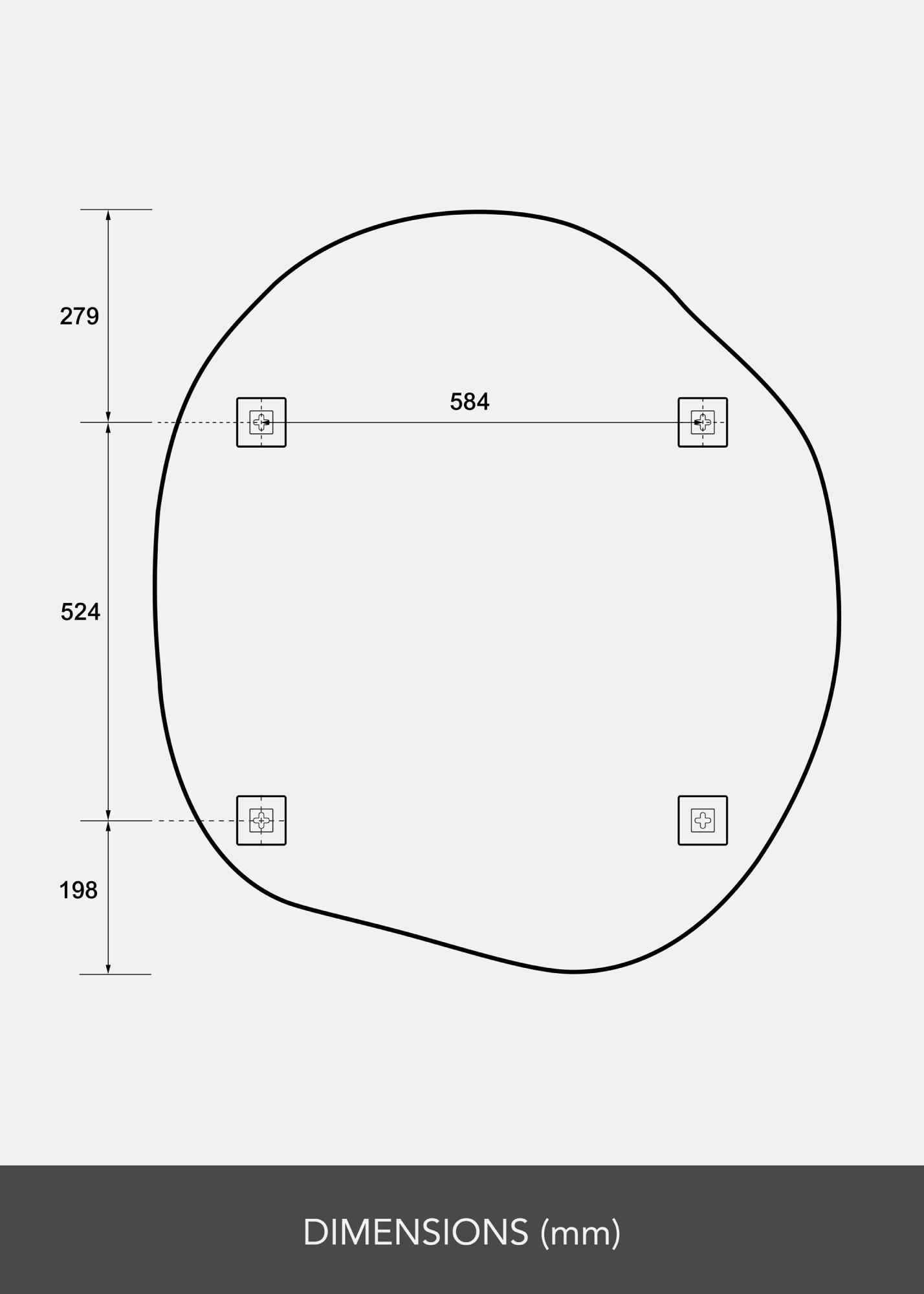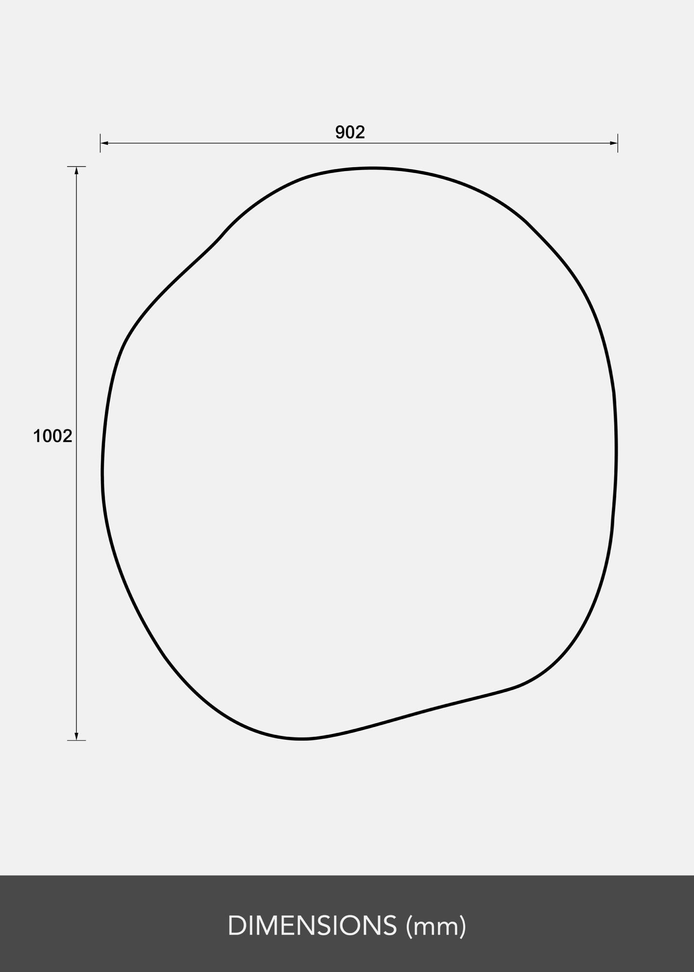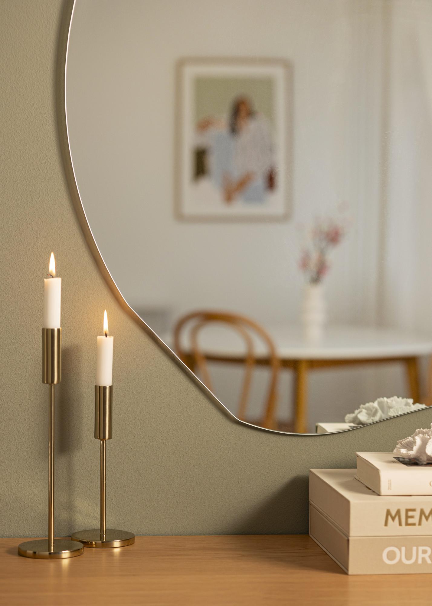 O espelho tem uma forma arredondada, quase orgânica, com linhas suaves e fluídas que criam uma sensação relaxante e convidativa. Este design faz com que o espelho seja um ponto focal natural no cômodo e traga uma sensação de elegância e suavidade para a sua decoração.