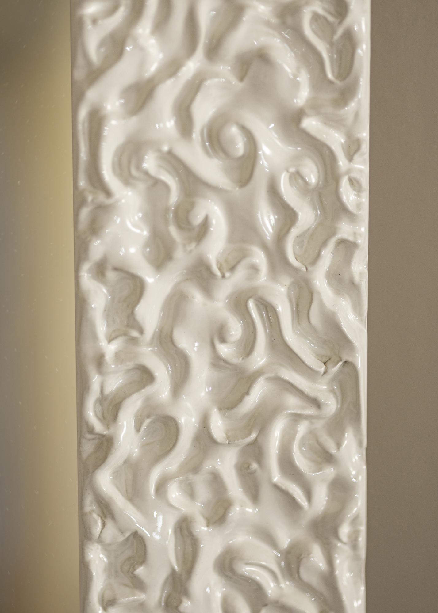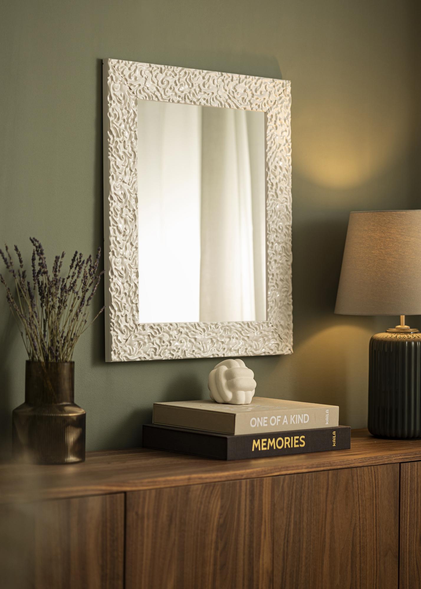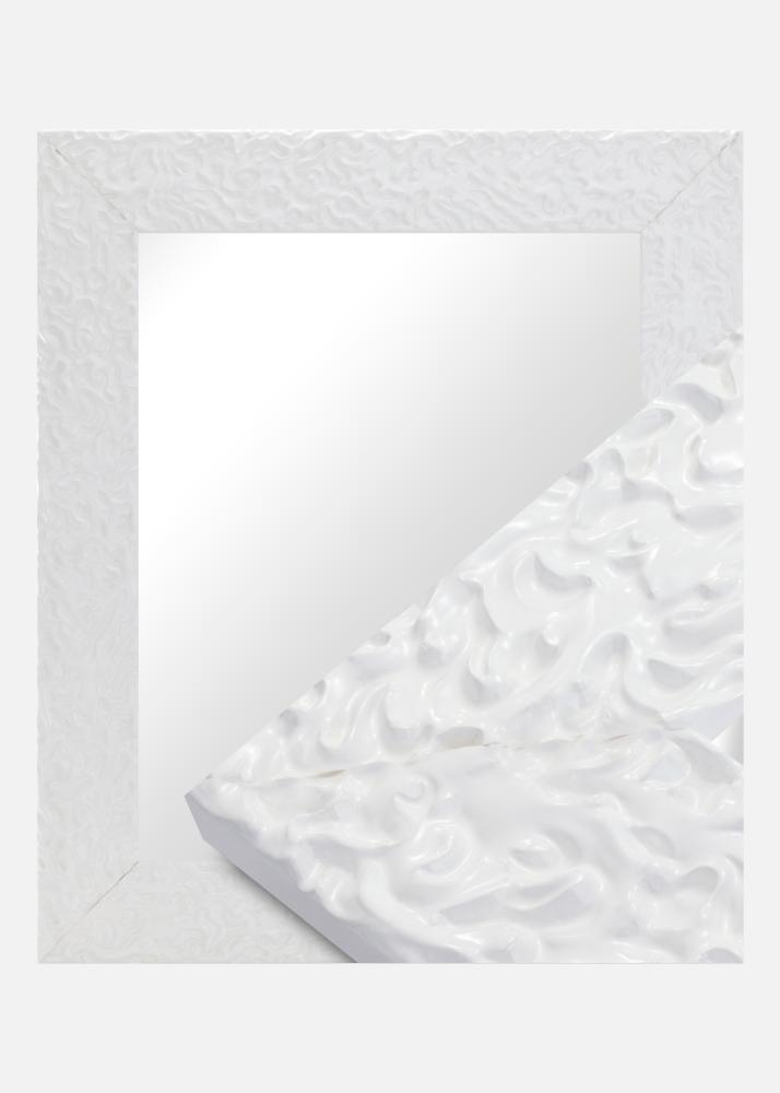 A superfície branca de alto brilho do espelho possui um padrão orgânico e vibrante que cria uma sensação moderna e elegante. Este acabamento brilhante reforça as formas suaves e fluidas e dá à moldura uma expressão exclusiva. É a solução perfeita para quem procura um detalhe marcante que combina inspiração clássica com design contemporâneo.