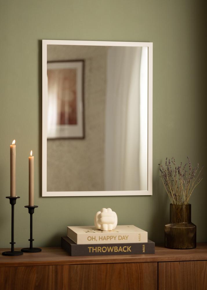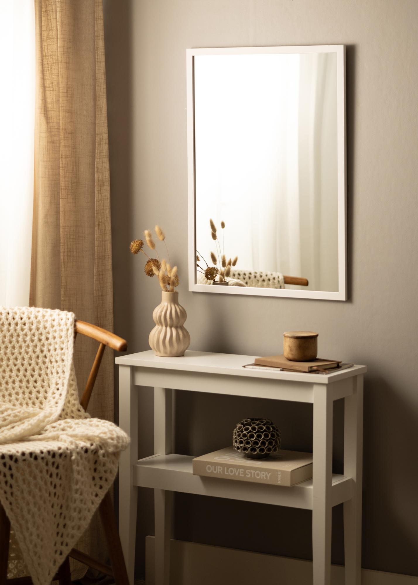 Este espelho tem uma aparência clássica com uma moldura de madeira pintada de branco, com 22 mm de largura e 15 mm de profundidade. A expressão tradicional é reforçada pelo vidro do espelho sem cor.