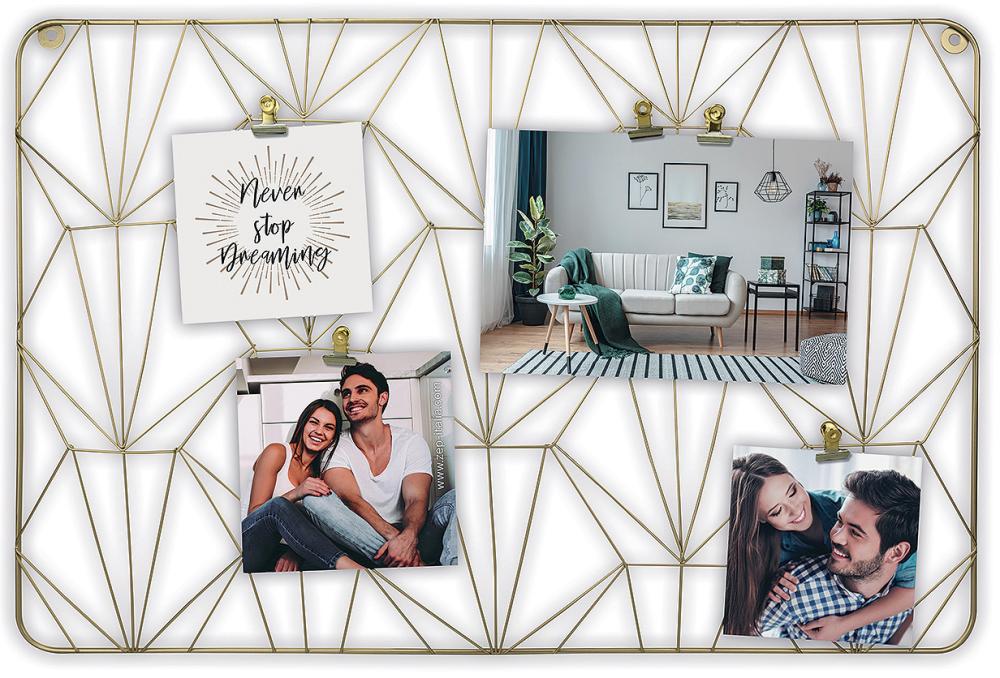 Conjunto de molduras desenhado como um quadro de avisos onde prende as suas fotos com clipes. A moldura é feita de metal e tem um tom dourado. Como você mesmo prende as suas fotos, pode escolher misturar fotos de diferentes tamanhos e também usar a sua criatividade para prender, por exemplo, pequenos pósteres ou notas bonitas! A moldura mede 62x41 cm no total. Esta moldura é especialmente adequada para ser colocada acima da mesa, na cozinha ou em qualquer outro lugar onde ela possa ser decorativa e funcional. Suporte de parede incluído.