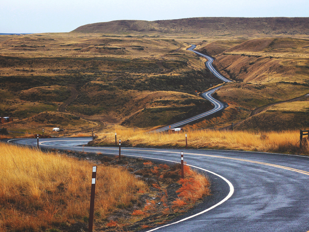 Póster com uma estrada asfaltada que serpenteia por uma paisagem de estepes queimadas pelo sol. As tonalidades de grama amarelo-marrom contrastando com a superfície fria do asfalto, que se destaca na paisagem aberta, fazem com que o olhar seja atraído para a imagem e siga a estrada. O cartaz fica bem numa moldura minimalista, onde o motivo pode se destacar e pode ser combinado com outras pinturas em um tema.