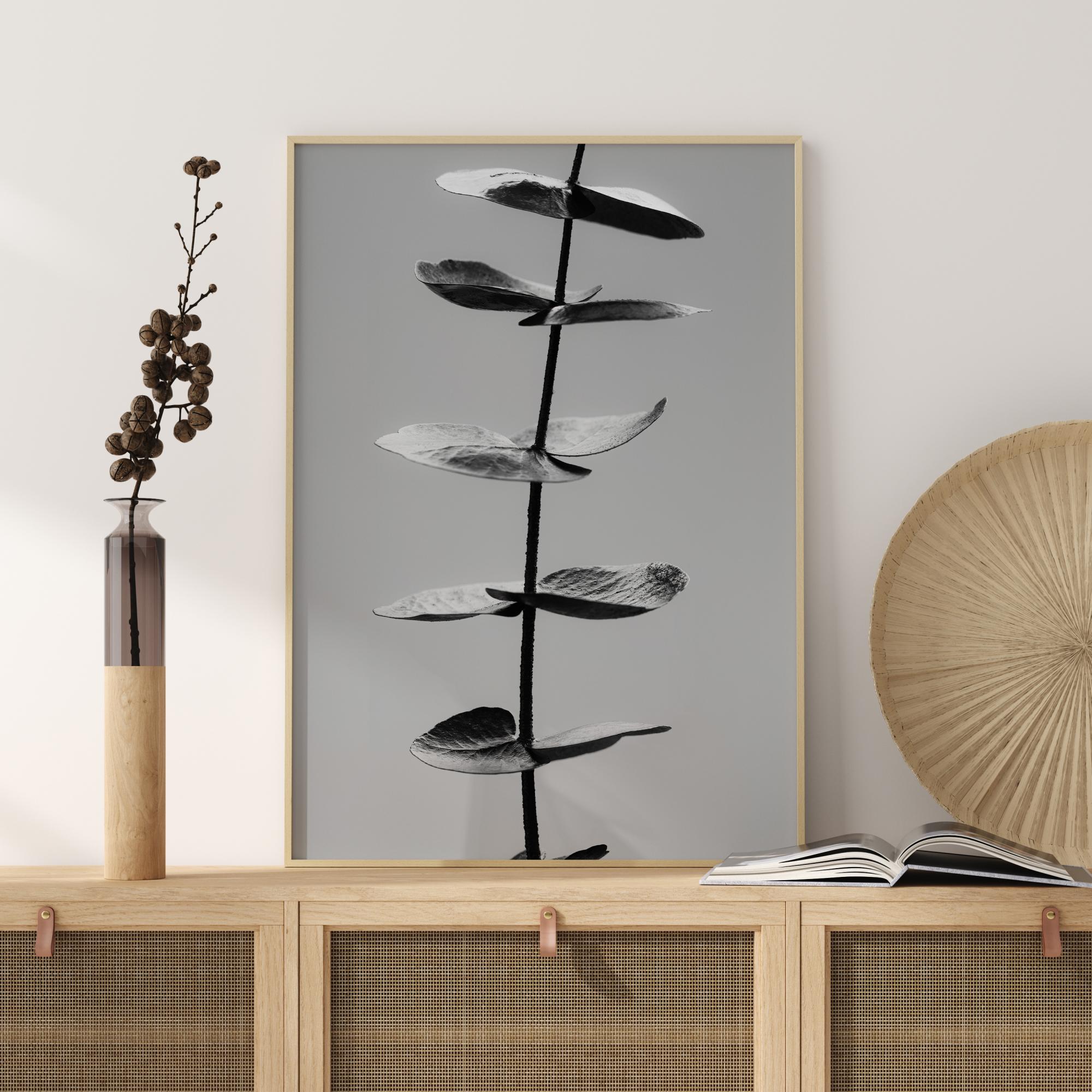 Um simples póster natural de um ramo de eucalipto em crescimento. O elegante preto e branco desta obra minimalista se encaixará bem e terá um efeito calmante num ambiente verde com luz solar quente.