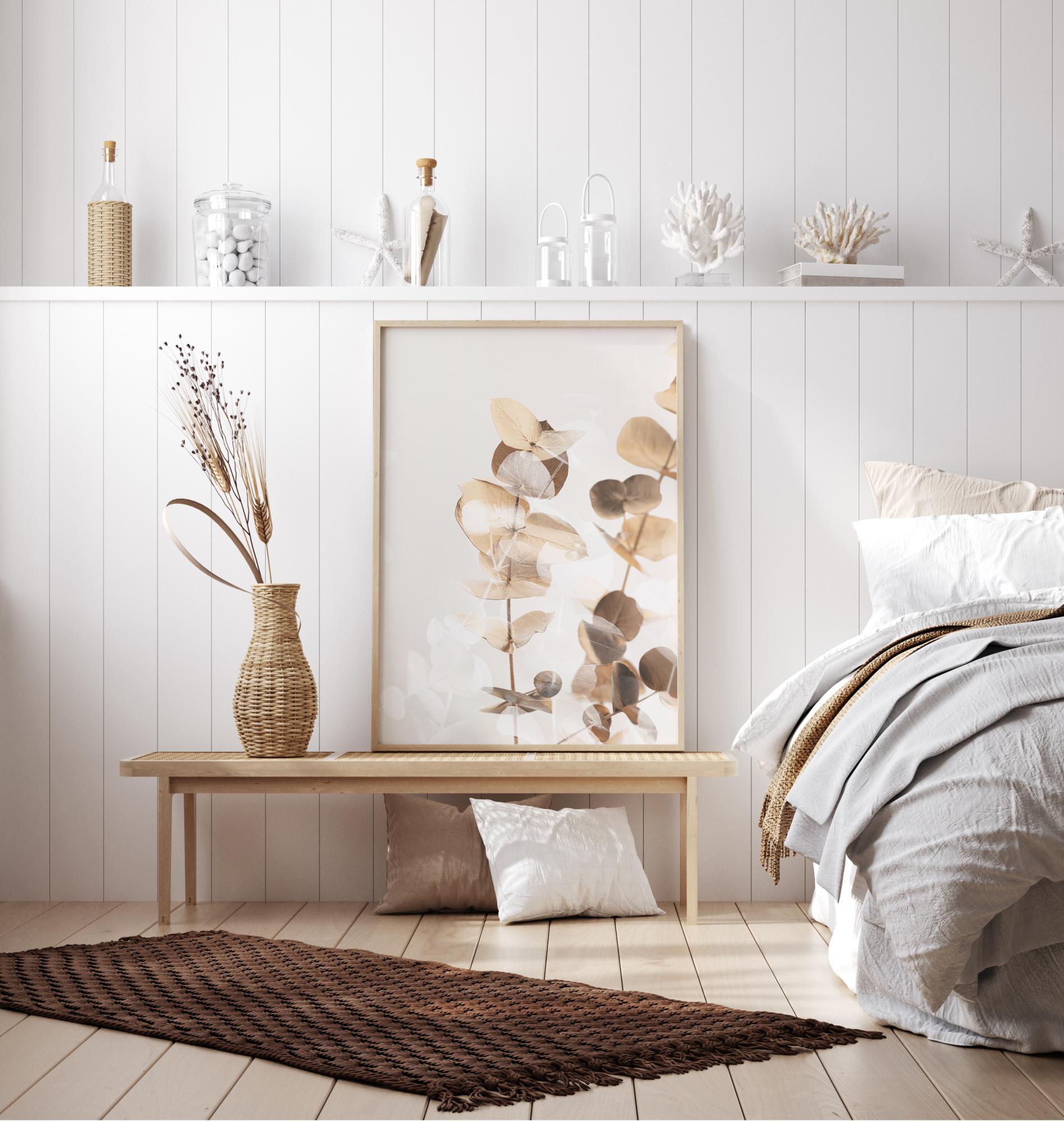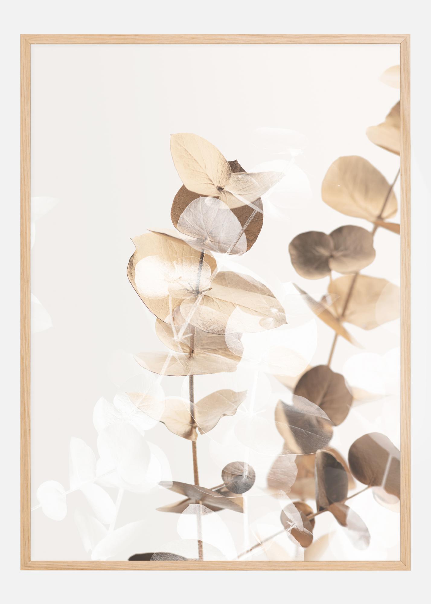 Um póster dourado com folhas e galhos de eucalipto. As folhas douradas e marrons se destacam em uma forma brilhante contra o simples fundo branco. Para realçar essas folhas, combine com uma parede dourada ou creme escuro semelhante para obter elegância extra.