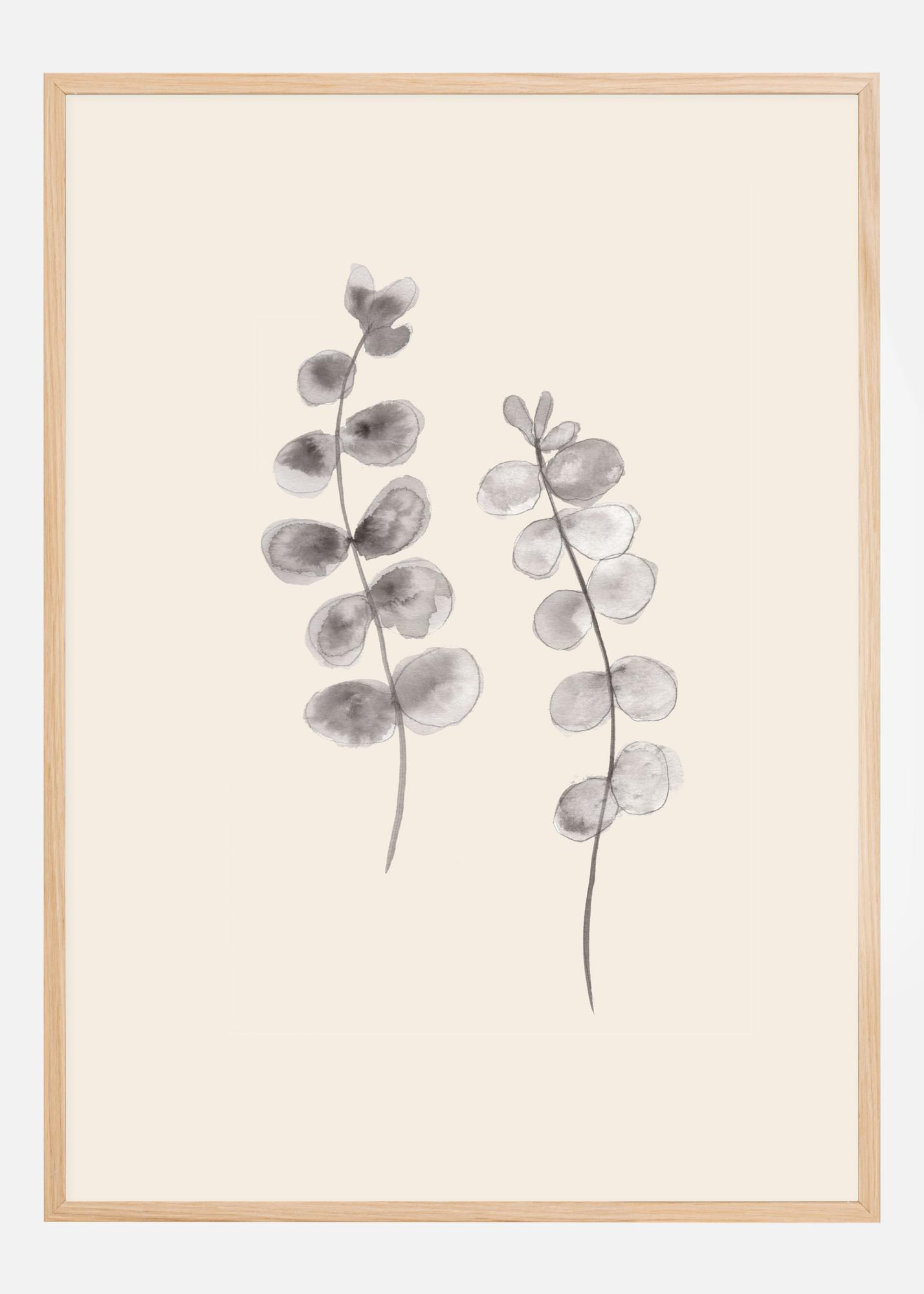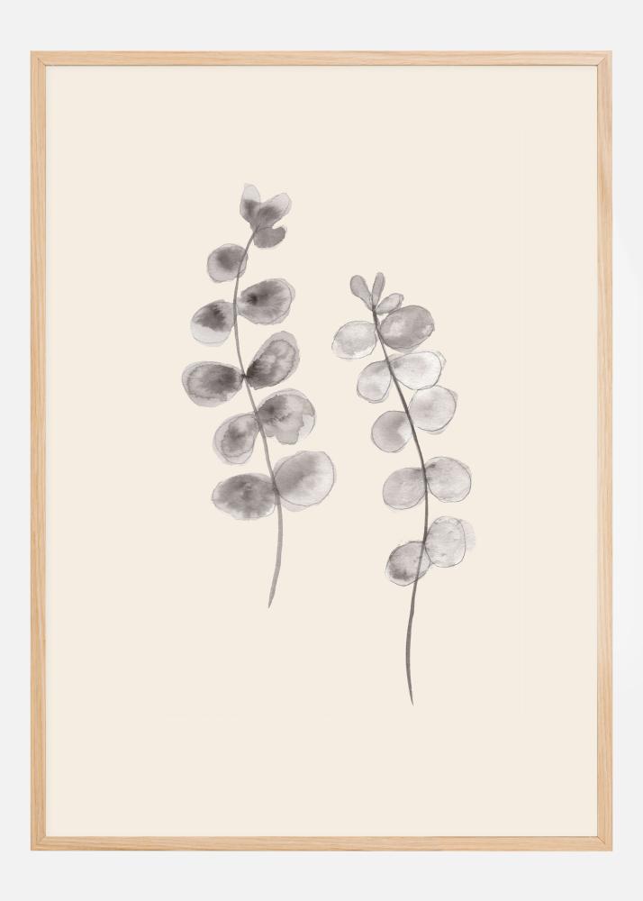 Um póster botânico com dois galhos cinzentos com folhas de eucalipto. No centro de um fundo branco, há dois galhos pintados de cinzento com folhas de eucalipto. Eles se curvam juntos para criar uma curva suave que guia o olhar através do póster. Pendure essa dança exuberante em sua casa para uma sensação calmante.
