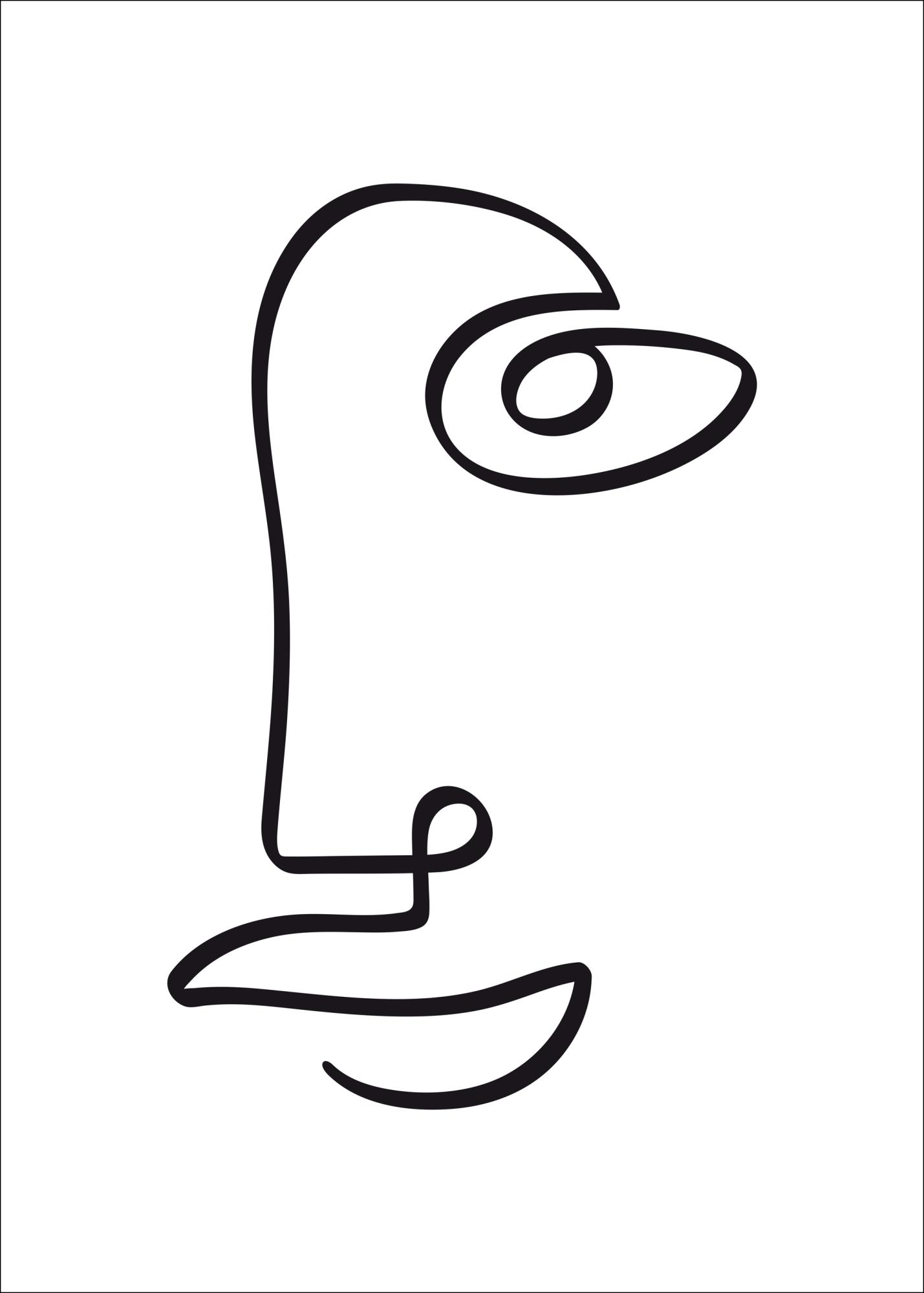 Um póster abstrato com um rosto, desenhado com uma linha preta. A simples linha preta se contorce na imagem para criar um lado de um rosto sem nunca sair do papel. Contemple esta imagem simples quando a pendurar em casa e tente ver outras figuras escondidas na obra.