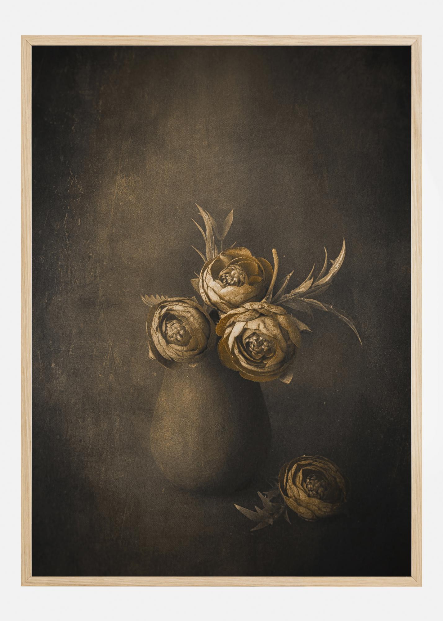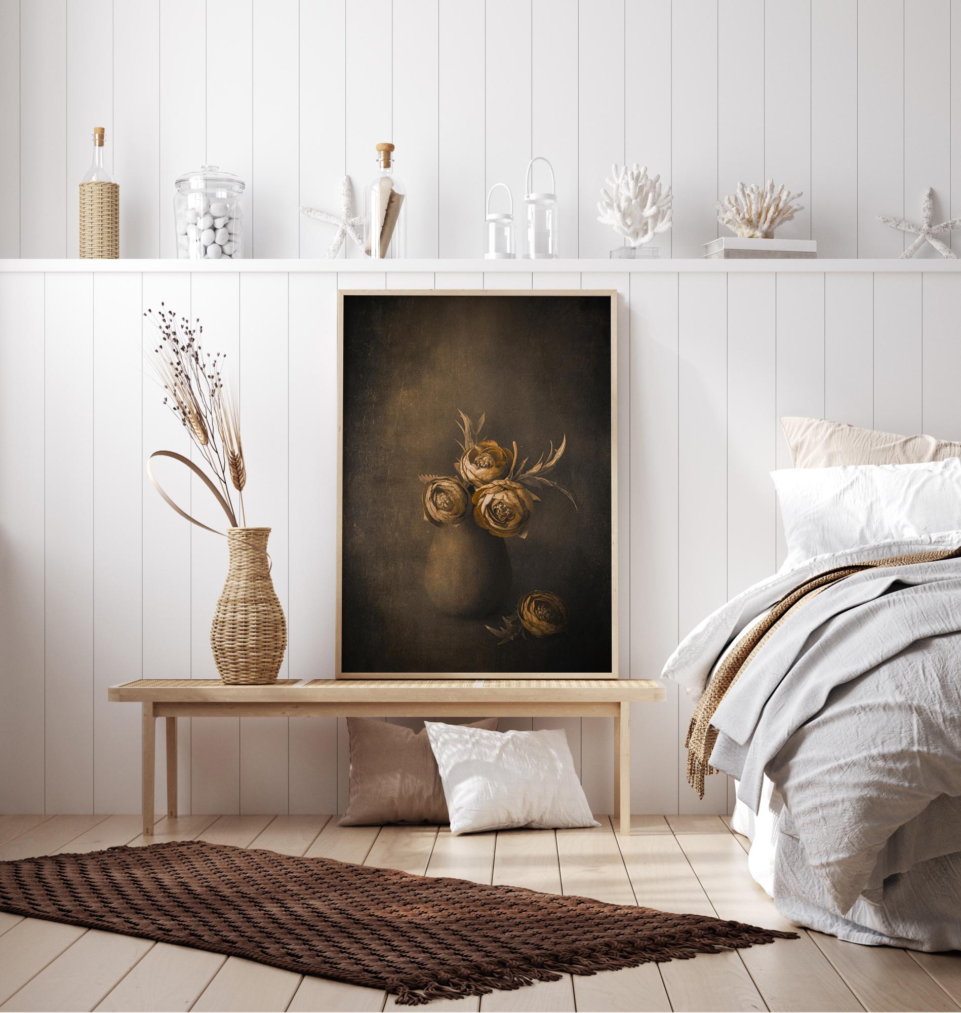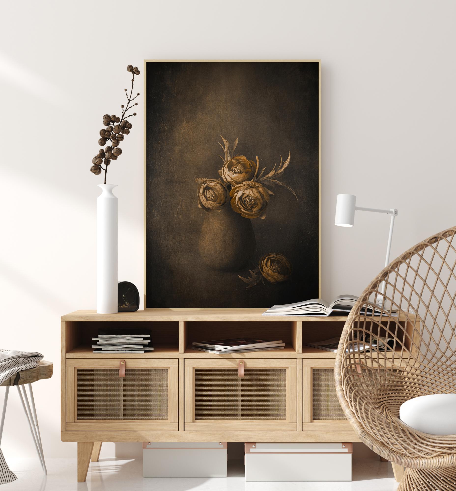 Um póster de natureza morta com flores douradas em um jarro de barro contra um fundo escuro. As flores douradas brilhantes se destacam na parede marrom mais escura da pintura. Combine isso com uma parede creme para elevar as flores para o próximo nível.