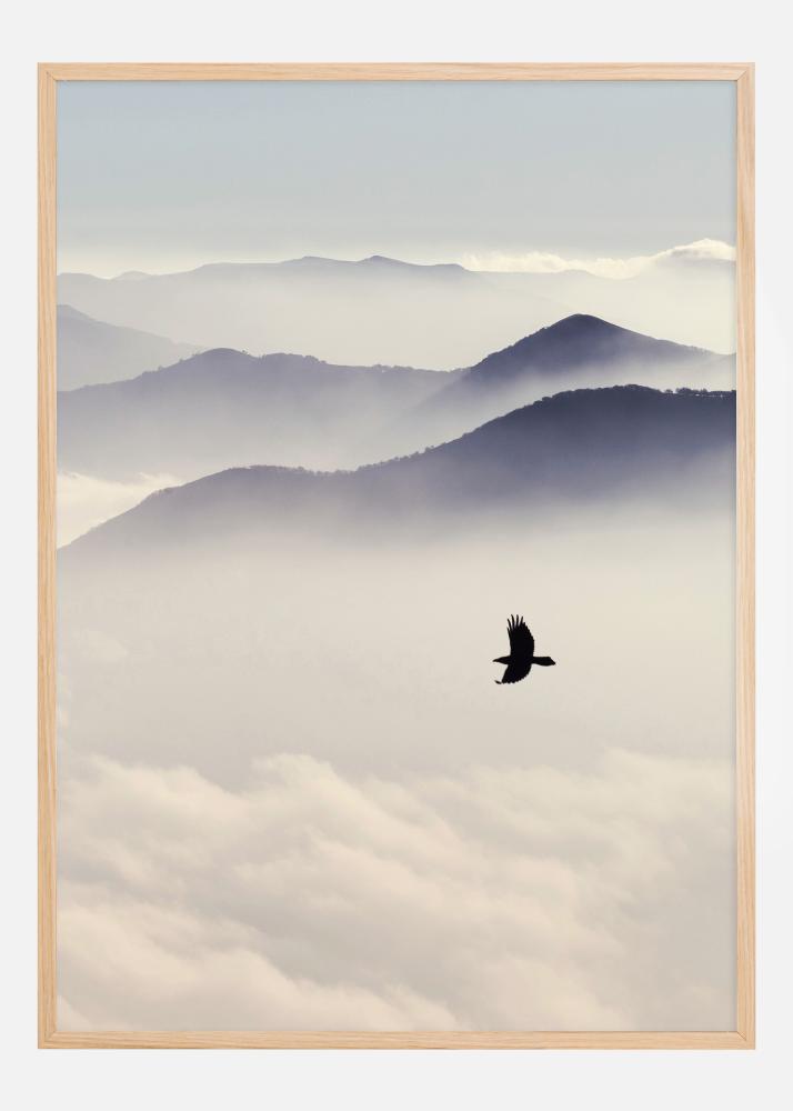 Este pôster inspirado na natureza captura uma imagem simples, mas poderosa de liberdade e silêncio. Um pássaro solitário navega majestosamente sobre um vale enevoado, com camadas de montanhas que gradualmente desaparecem na suave luz do amanhecer ou do crepúsculo. Os tons suaves e a paisagem minimalista proporcionam uma sensação de paz e liberdade ilimitada.