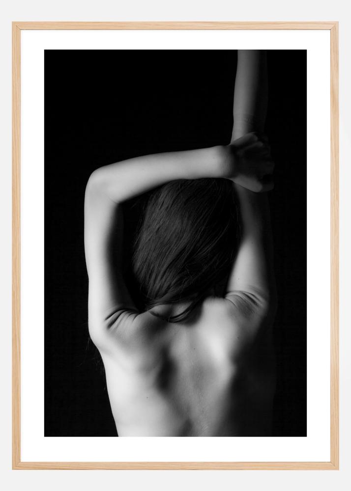 Um póster de retrato com as costas de uma mulher. Esta imagem em preto e branco destaca os músculos das costas enquanto ela levanta um braço alto e dobra o outro braço sobre a cabeça. Partes dela estão envoltas em sombra. Pendure esta obra em casa para obter uma impressão um pouco artística.