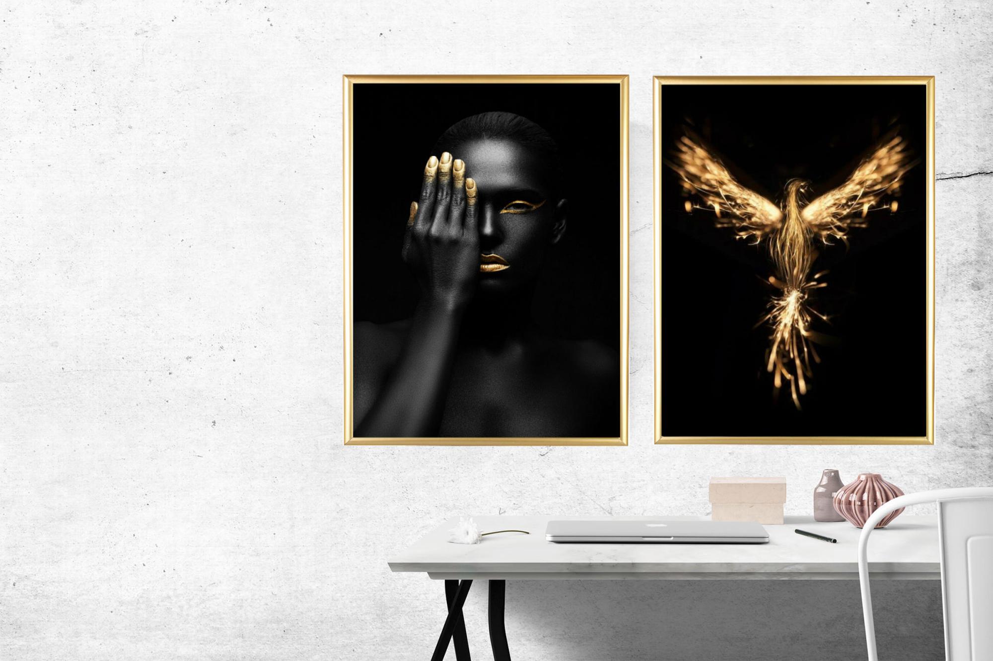Através da arte gráfica, a ave Fênix toma forma em um show de fogos de artifício de tons dourados contra um fundo preto. Um póster quente e agradável num formato minimalista, perfeito para combinar com outros favoritos em uma colagem maior.