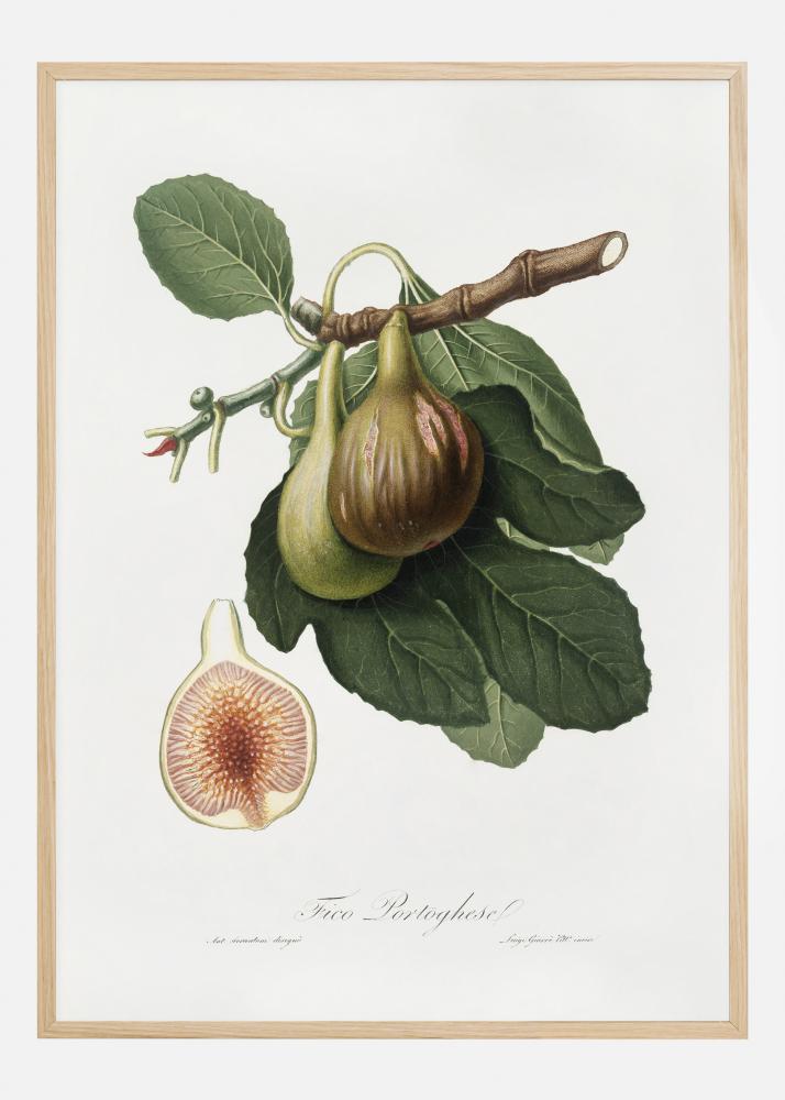 Um póster botânico com uma ilustração de figo. Esta imagem lembra as antigas imagens escolares, com o seus desenhos simples, mas detalhados, na parede. A pintura em aquarela captura todos os detalhes, mostrando também uma seção transversal do figo e suas sementes internas.