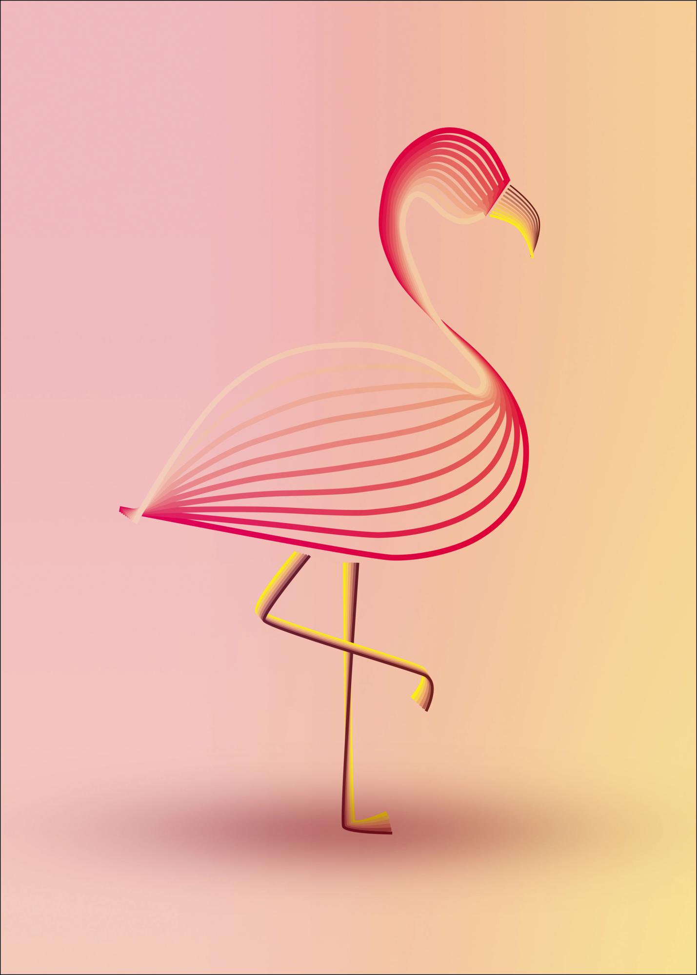 Um póster abstrato com um flamingo rosa engraçado e alegre. O flamingo é composto por diferentes linhas simples de rosa quente e amarelo. Ele dá passos altos sobre o fundo rosa pálido. Para uma expressão doce e festiva, pendure-o numa parede branca e deixe as cores brilharem.
