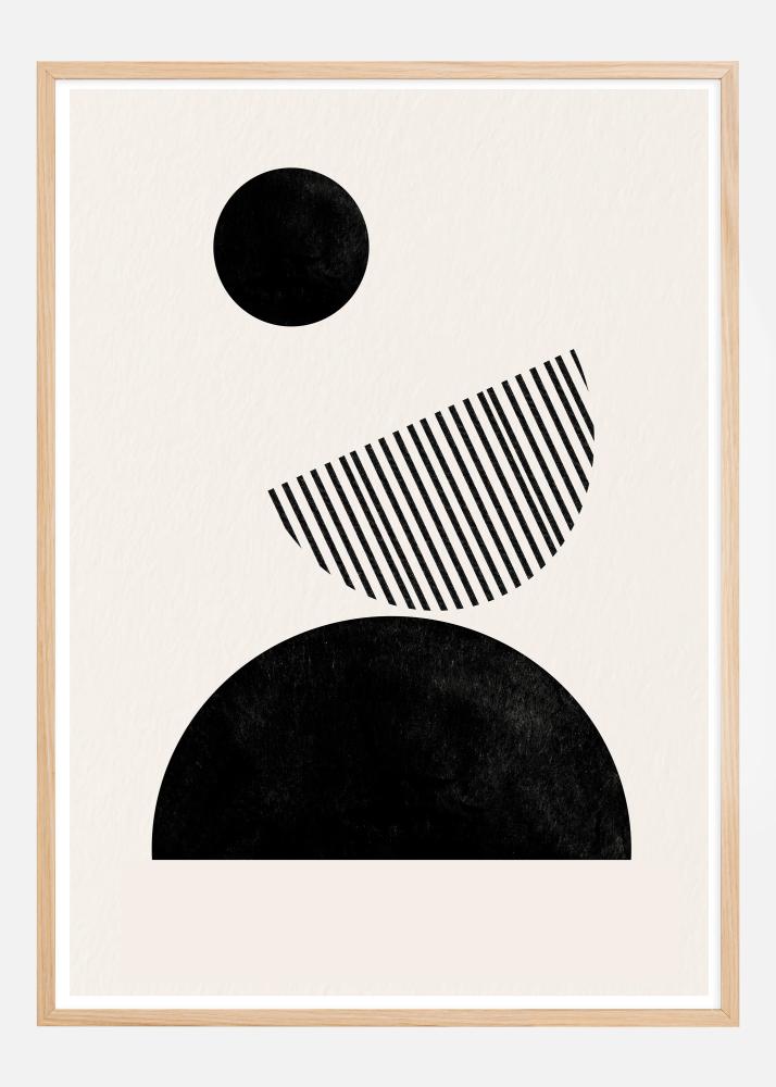 Este pôster artístico é caracterizado pelo seu uso lúdico de formas geométricas e texturas para criar uma composição equilibrada e moderna. Um grande círculo preto fica no topo, seguido por um semicírculo diagonalmente estriado e uma forma de semicírculo sólido preto na base. Cada elemento contribui para uma sensação de movimento e dinamismo, enquanto a coloração unificada cria uma sensação de unidade e simplicidade.