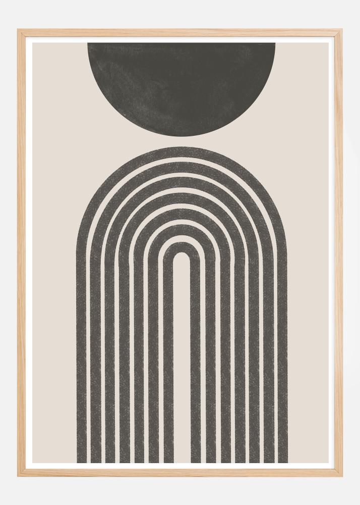 Este cartaz artístico mostra uma fusão de precisão geométrica e suavidade orgânica. A parte superior do design é composta por um semicírculo preto que irradia uma presença tranquilizadora contra o fundo quente e neutro. Abaixo disso, ergue-se uma série de arcos pretos que formam harmoniosamente uma forma semelhante a um portal, criando um contraste entre a rígida geometria e as curvas abstratas do círculo preto. A paleta de cores simples com preto contra um fundo off-white oferece uma impressão moderna e elegante, perfeita para a casa ou escritório contemporâneo.