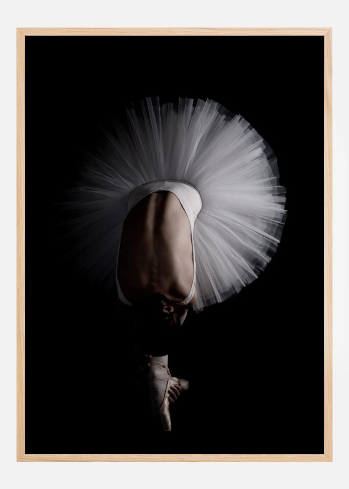 Um póster llamativo de uma bailarina de balé se inclinando para frente para alcançar seus sapatos. O fundo preto faz com que a saia de balé branca se destaque em um círculo de luz ao seu redor. As linhas fortes nas costas direcionam o olhar para os pés elegantemente pontiagudos. Elegância e drama se fundem nesta imagem única.