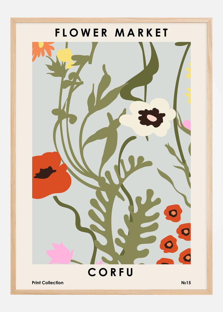"CORFU" está elegantemente impresso na parte inferior, acima de "Print Collection ?15", reforçando a sensação de lugar e pertencimento. Este poster iluminaria qualquer espaço, trazendo um pouco do charme mediterrâneo para a sua casa. O esquema de cores é inspirado pela rica flora de Corfu, adicionando um toque de cor e um interesse visual a qualquer ambiente em que seja colocado. É um poster perfeito para aqueles que querem se rodear com a memória das praias ensolaradas de Corfu e dos mercadinhos de flores vibrantes.