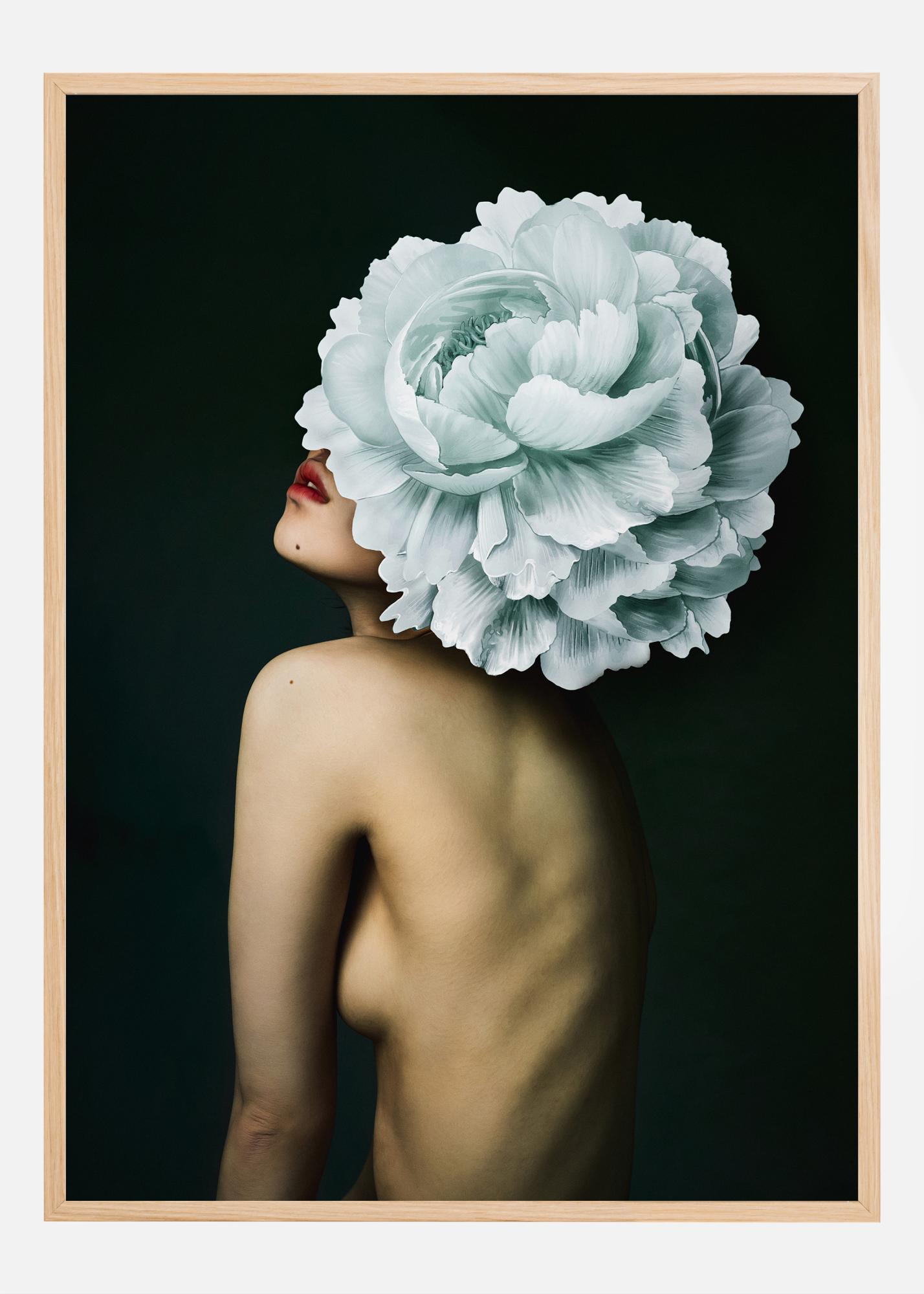 Este cartaz retrata uma composição fascinante e artística onde a beleza humana encontra as maravilhas da natureza. A imagem retrata uma pessoa vista de costas, a cabeça substituída por uma flor grandiosa, quase desproporcional, em branco. O contraste entre a pele suave e a flor rica em detalhes cria uma simbiose visual que é ao mesmo tempo onírica e sugestiva. O esquema de cores da impressão é simples, mas poderoso, com tons de branco, cor da pele e o vermelho profundo dos lábios, contra um fundo escuro, quase monocromático.