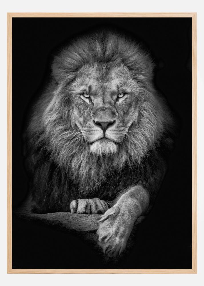 Uma fotografia em preto e branco em close-up de um leão olhando diretamente para o espectador. O fundo escuro e o olhar intenso criam um atrativo encantador para a tela. Este é um póster que fica tão bom sozinho quanto em conjunto com outros favoritos em uma colagem maior.