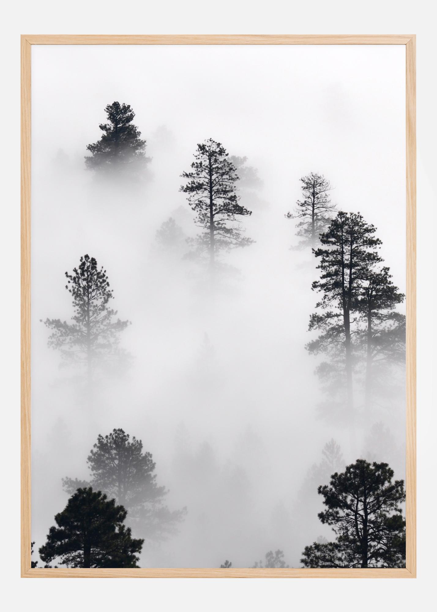 Um incrível póster de paisagem com uma floresta na neblina. Altas copas de árvores escuras emergem da neblina branca tenue, criando um forte contraste entre a neblina e as árvores. Traga a sensação fresca de inverno para sua casa quando pendurar esta numa parede neutra.