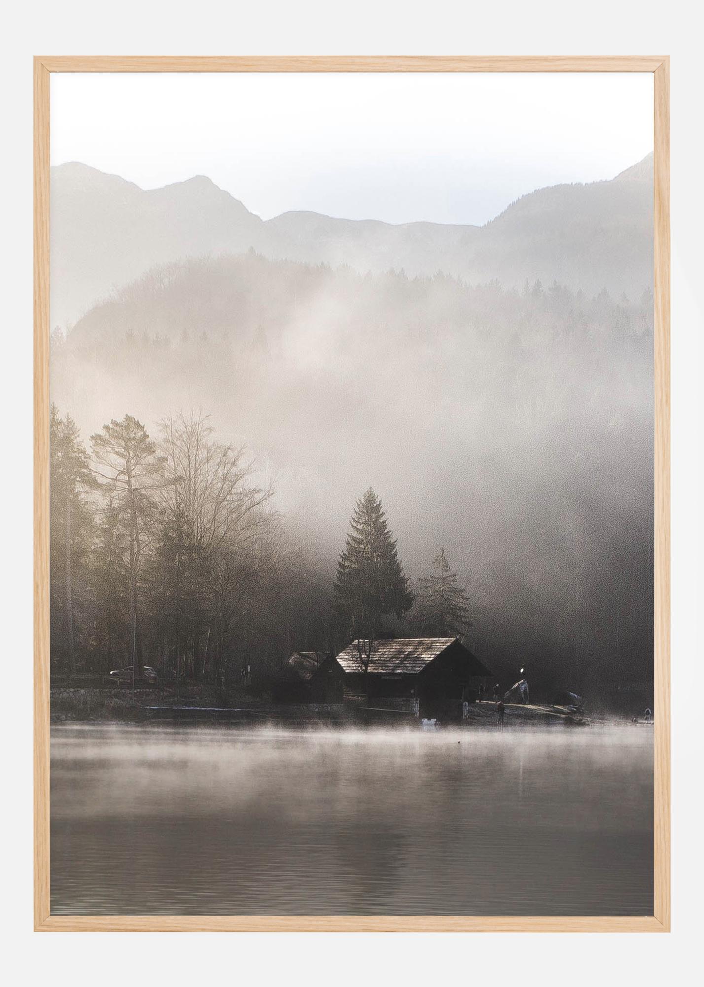 Um póster agradável com uma cabana nas montanhas, localizada à beira de um lago nebuloso. Tons suaves de cores pastéis dão a esta imagem uma sensação suave, onde o sol da manhã cedo brilha do lado direito para dissipar a névoa. Pendure isso numa parede simples e perca-se na solidão da natureza selvagem e na simplicidade deste póster atmosférico.