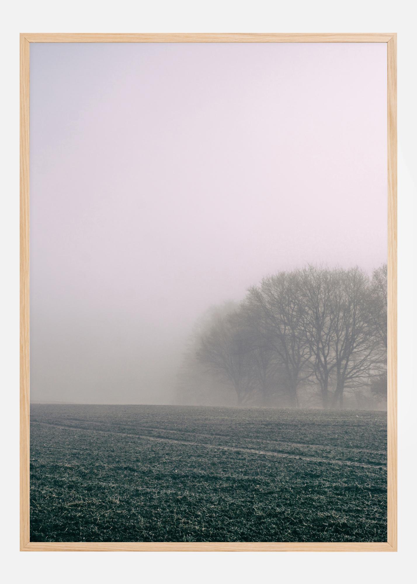 Um póster claro com um campo e árvores em neblina matinal. O sol nascente preenche a foto com luz, iluminando o campo verde e fazendo a neblina se dissipar. Árvores na neblina preenchem o fundo desta cena matinal muito britânica.