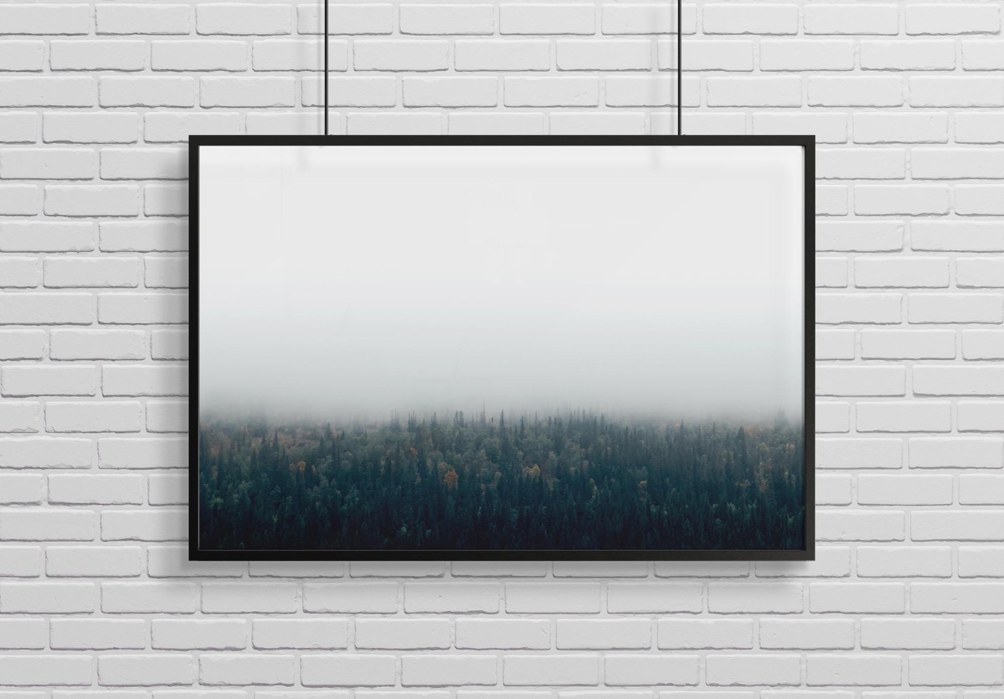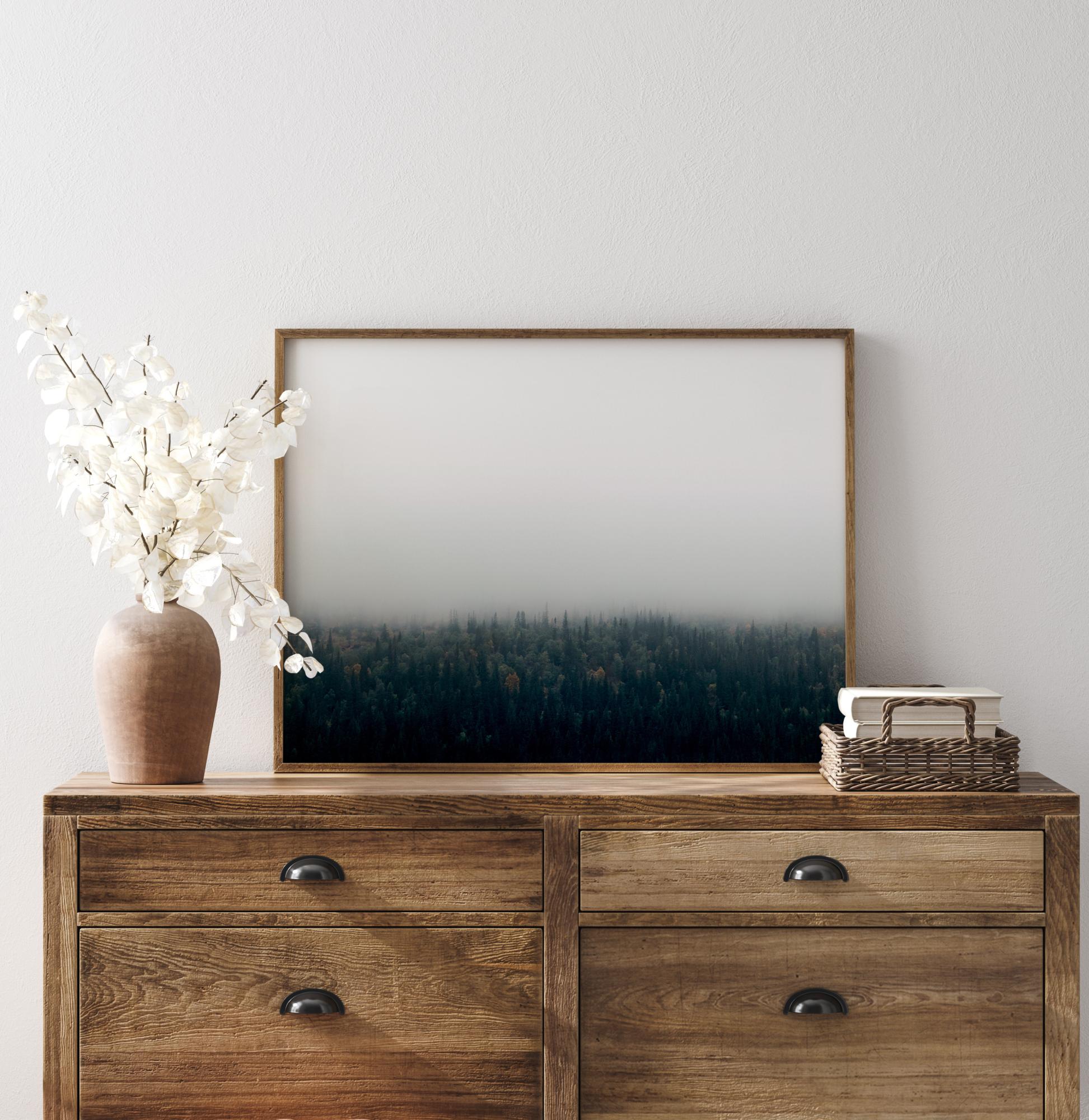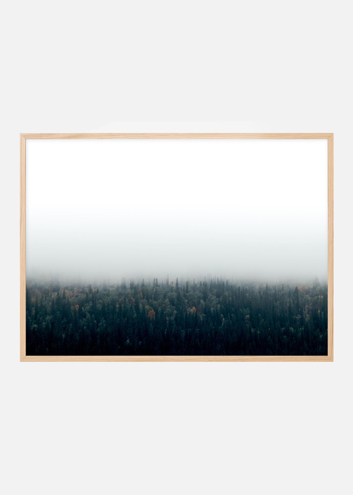 Um póster fotográfico de uma floresta extensa descansando sob um denso nevoeiro. As árvores verdes contrastam fortemente com o céu branco. Um belo póster natural que é fácil de combinar com outros favoritos. porque não criar uma galeria de parede maior com o tema da natureza?