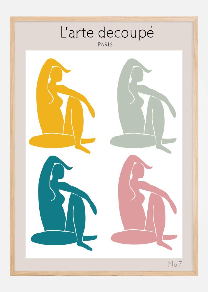 Este poster colorido e contemporâneo da série 'L'arte découpé' apresenta quatro figuras estilizadas em uma composição dinâmica e harmoniosa. Cada figura é cuidadosamente criada em uma cor distinta - amarelo solar, azul celeste, verde suave e rosa quente - e está posicionada contra um fundo cinza que proporciona uma expressão calma e equilibrada. Esta impressão artística celebra a diversidade e o movimento da forma humana através de seu design abstrato e simplificado, criando uma expressão visual forte que se adapta bem a um estilo de decoração moderno.
