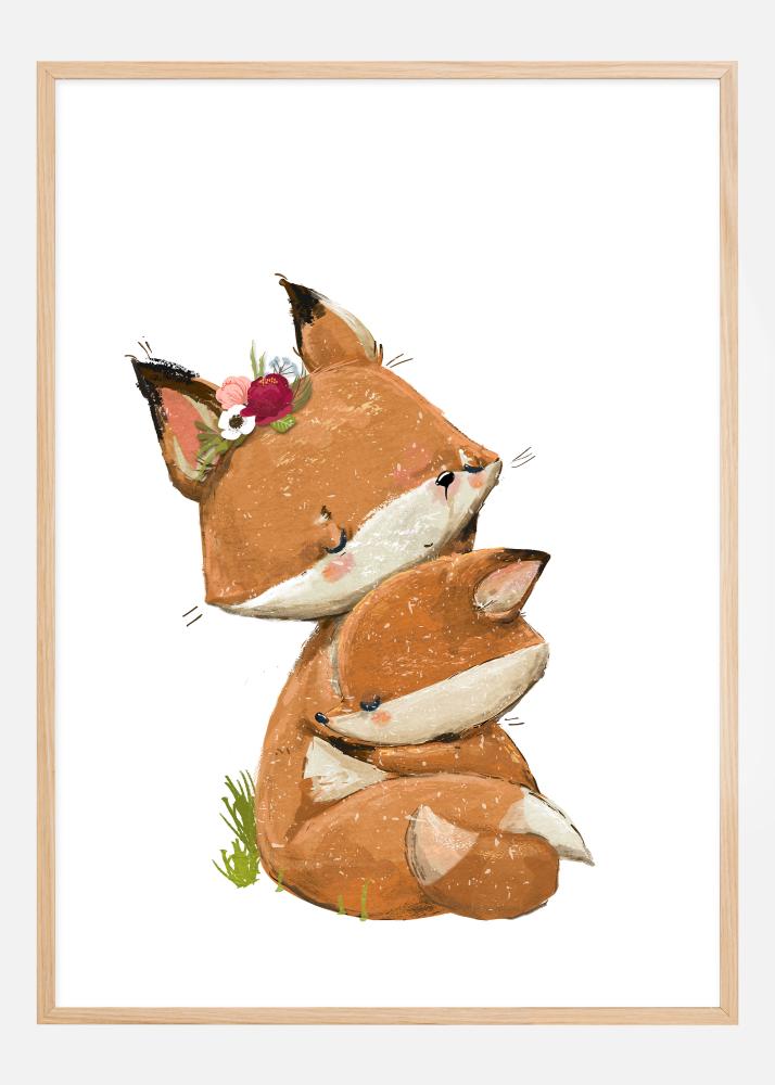Redefina a sensação de ternura com este belo pôster que retrata uma mamãe raposa abraçando seu jovem filho em um carinho terno. Os tons quentes da pelagem da raposa, juntamente com as flores delicadas colocadas na cabeça, criam uma imagem que é tanto calorosa quanto esteticamente atraente. Esta ilustração captura a essência do amor materno e o vínculo especial entre pai e filho.