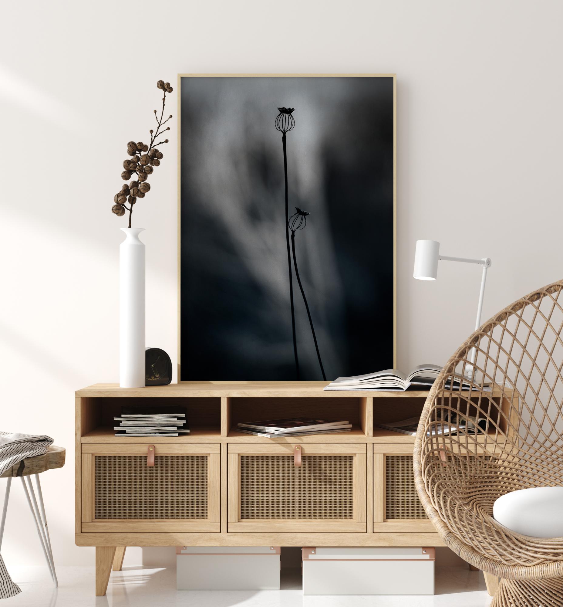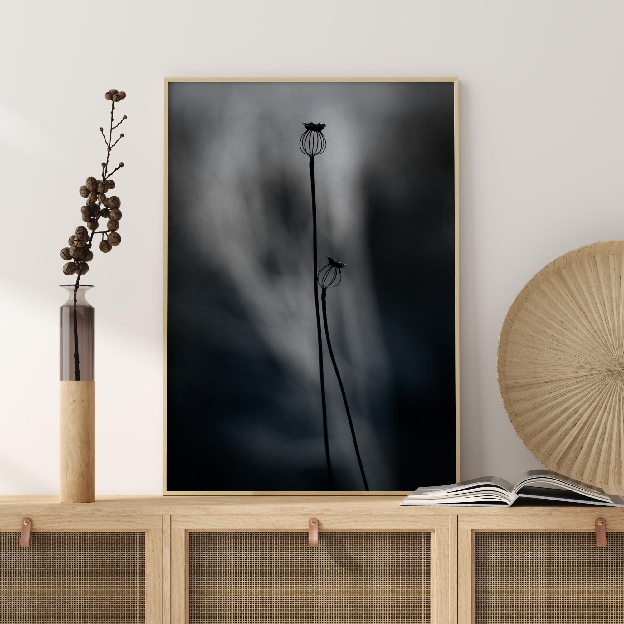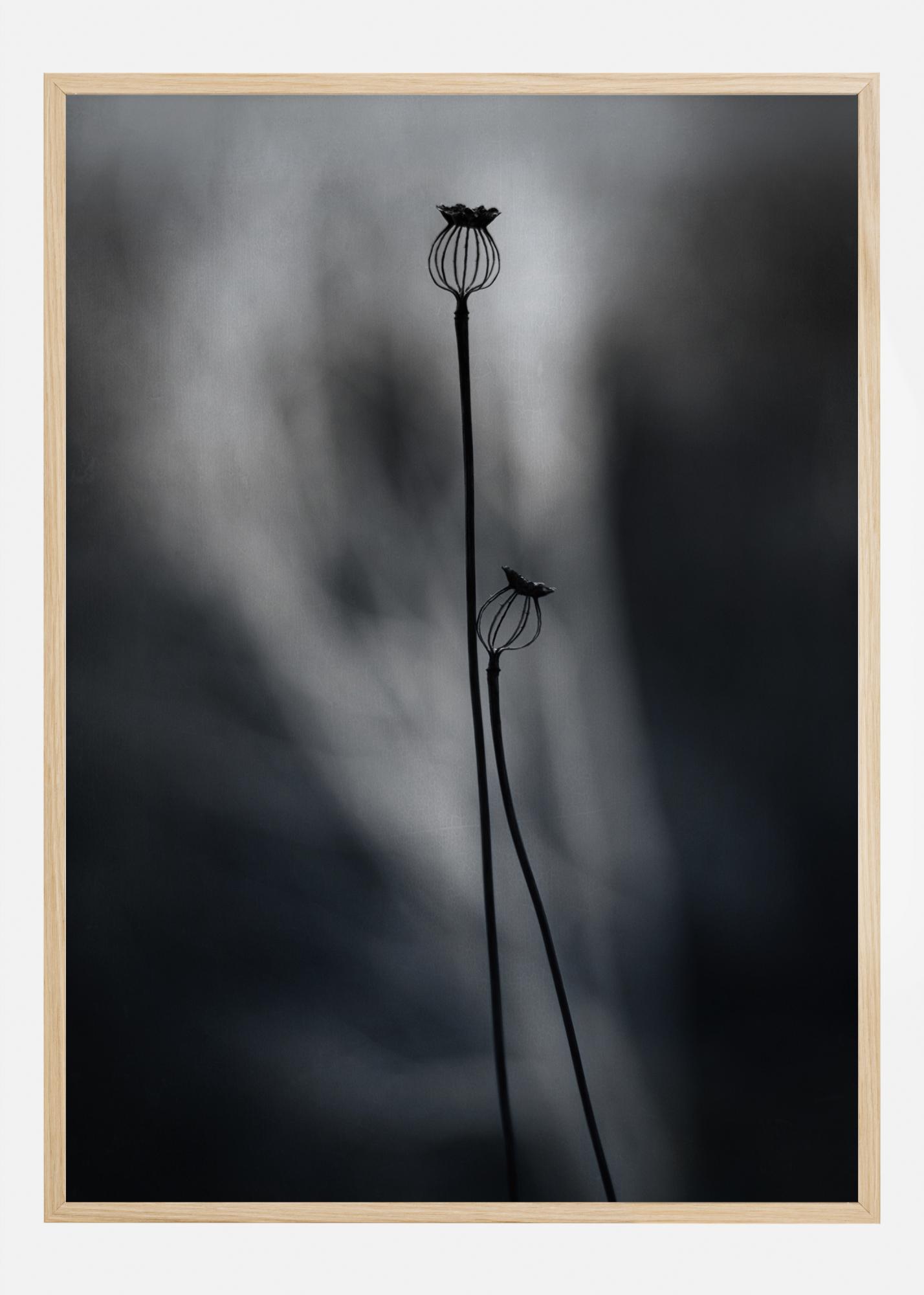 Um póster etéreo de duas cápsulas de papoula contra um fundo levemente desfocado. Esta imagem abstrata irá cativá-lo por muitas horas. Traga essa incrível mistura de tranquilidade e movimento para sua casa.