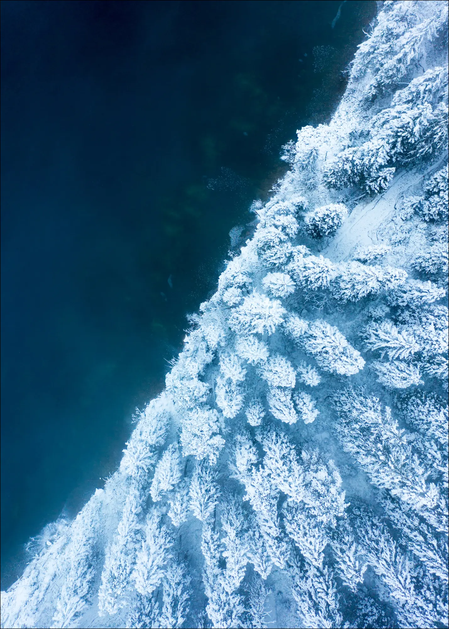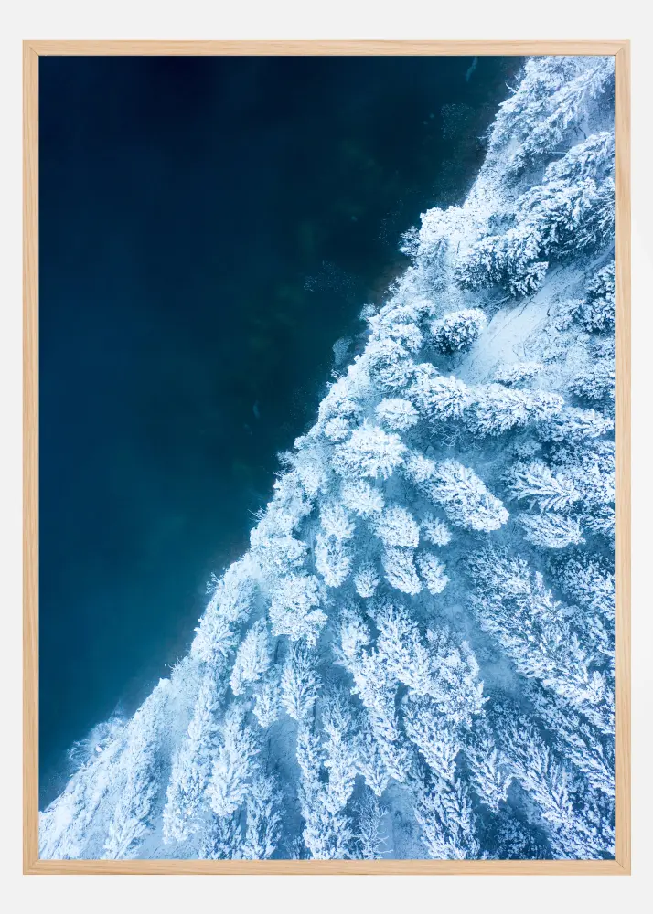 Um emocionante póster fotográfico em perspectiva de pássaro, onde a floresta coberta de neve encontra um mar congelado em um diagonal nítido. Um belo póster de natureza em tons frios, perfeito para fazer parte de uma grande colagem.